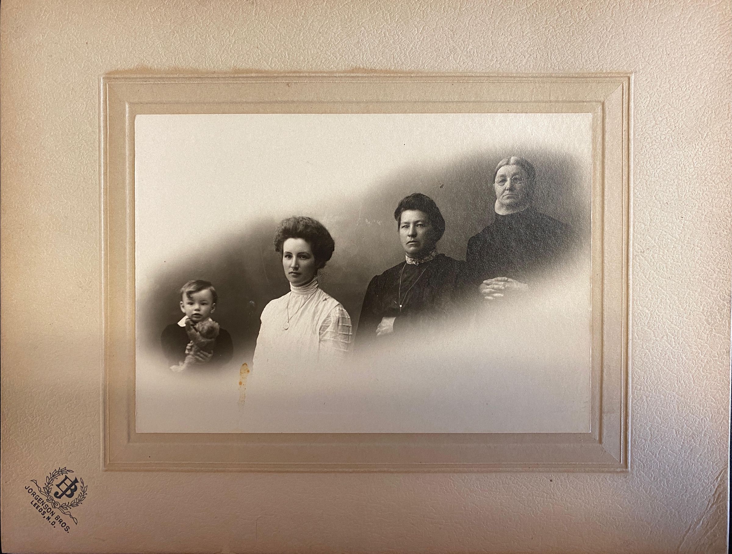 This photograph of four generations was taken by Jorgenson Bros., photographers, at Leeds, North Dakota. Second from the left appears to be Clara Fosen.Cataloged By