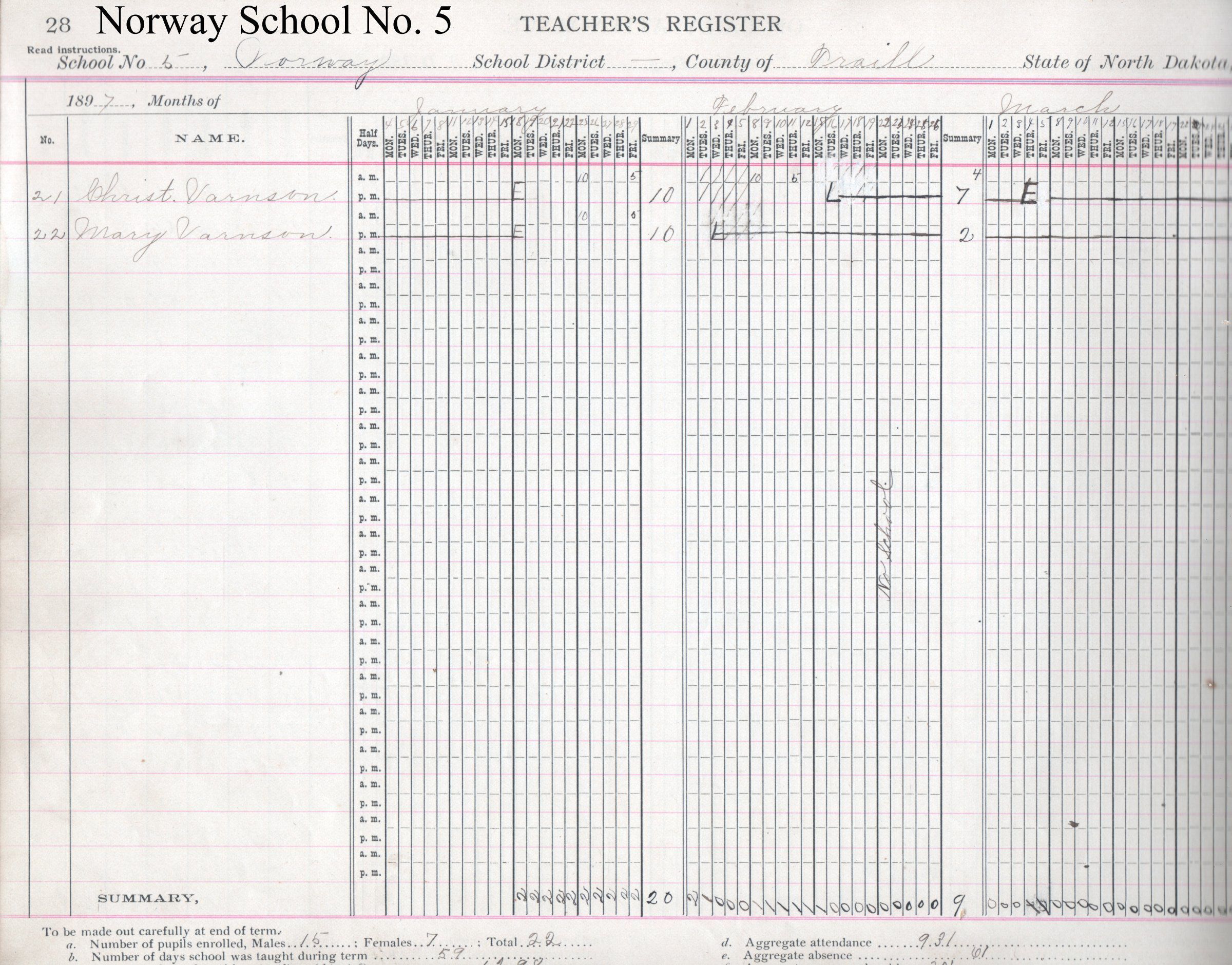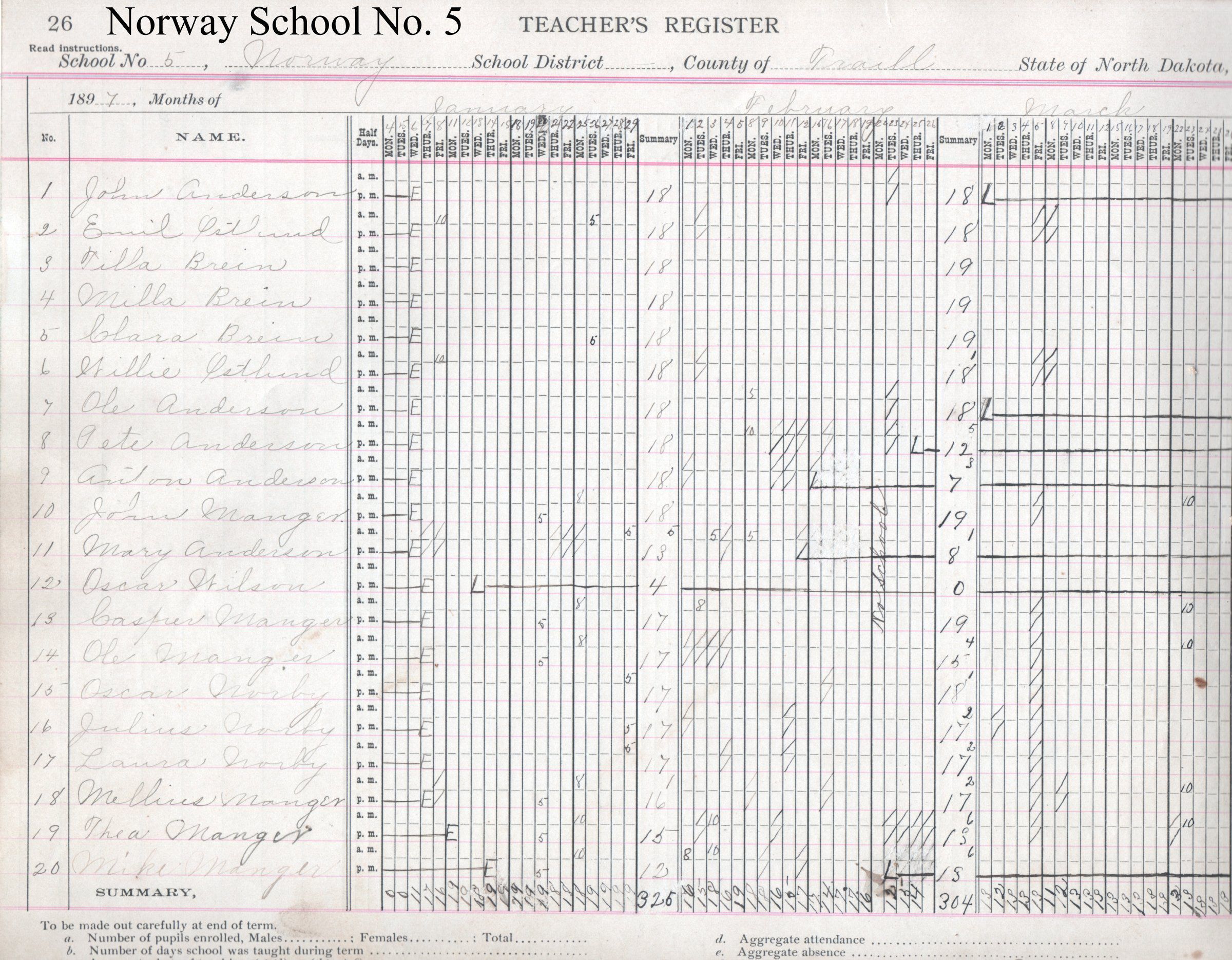 On the Teacher’s Register pages for January, February & March 1897, Mary Olson kept attendance records for 22 students including Anton Anderson, John Anderson, Mary Anderson, Ole Anderson, Pete Anderson, Clara Brein, Milla Brein, Tilla Brein, Casper Manger, John Manger, Mellius Manger, Mike Manger, Ole Manger, Thea Manger, Julius Norby, Laura Norby, Oscar Norby, Emil Ostlund, Willie Ostlund, Christian Varnson, Mary Varnson, and Oscar Wilson.