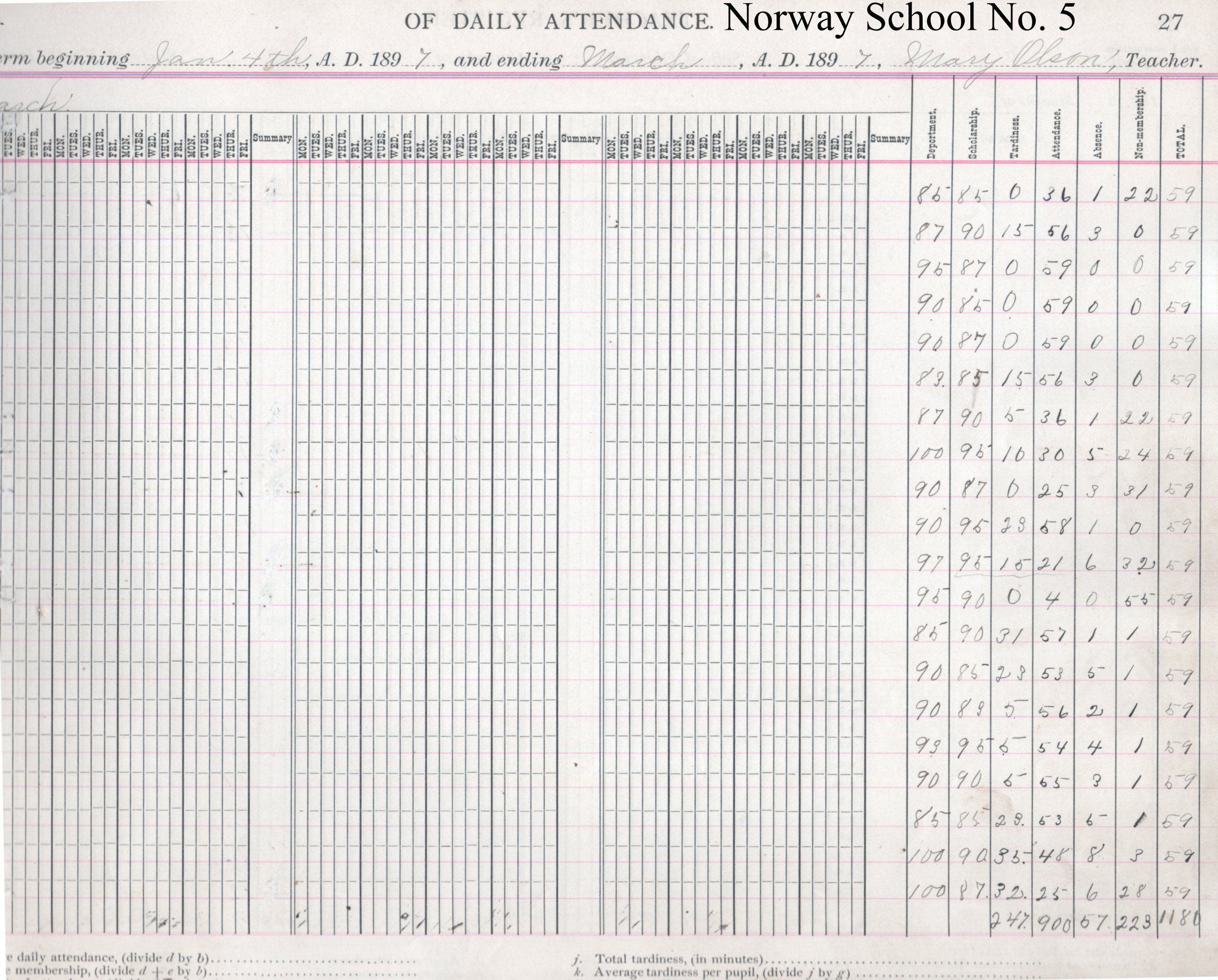 In the Spring Term of 1897, the Norway No. 5 teacher was Mary Olson.