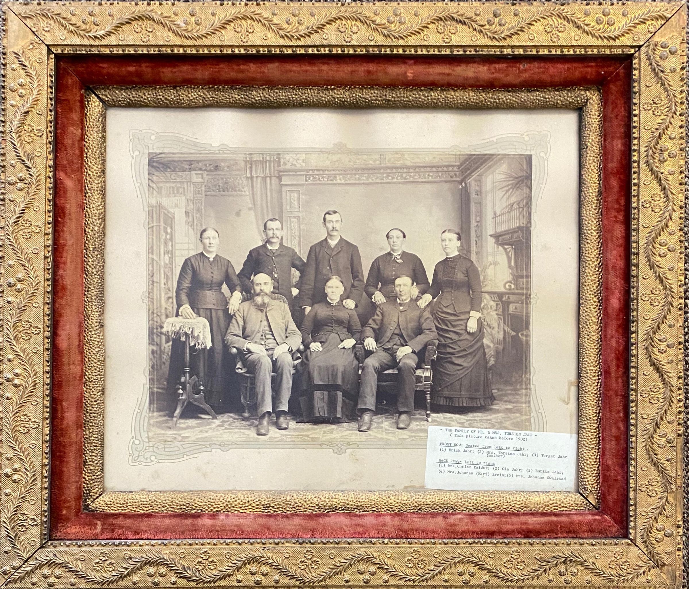 Photograph was taken before 1902. Front row seated: Erick Jahr; Mrs. Torsten Jahr; and Torger Jahr Back row: Mrs. Christ Kaldor; Ole Jahr; Luritz Jahr; Mrs. Johanes (Kari) Brein; and Mrs. Johanne Swalstad