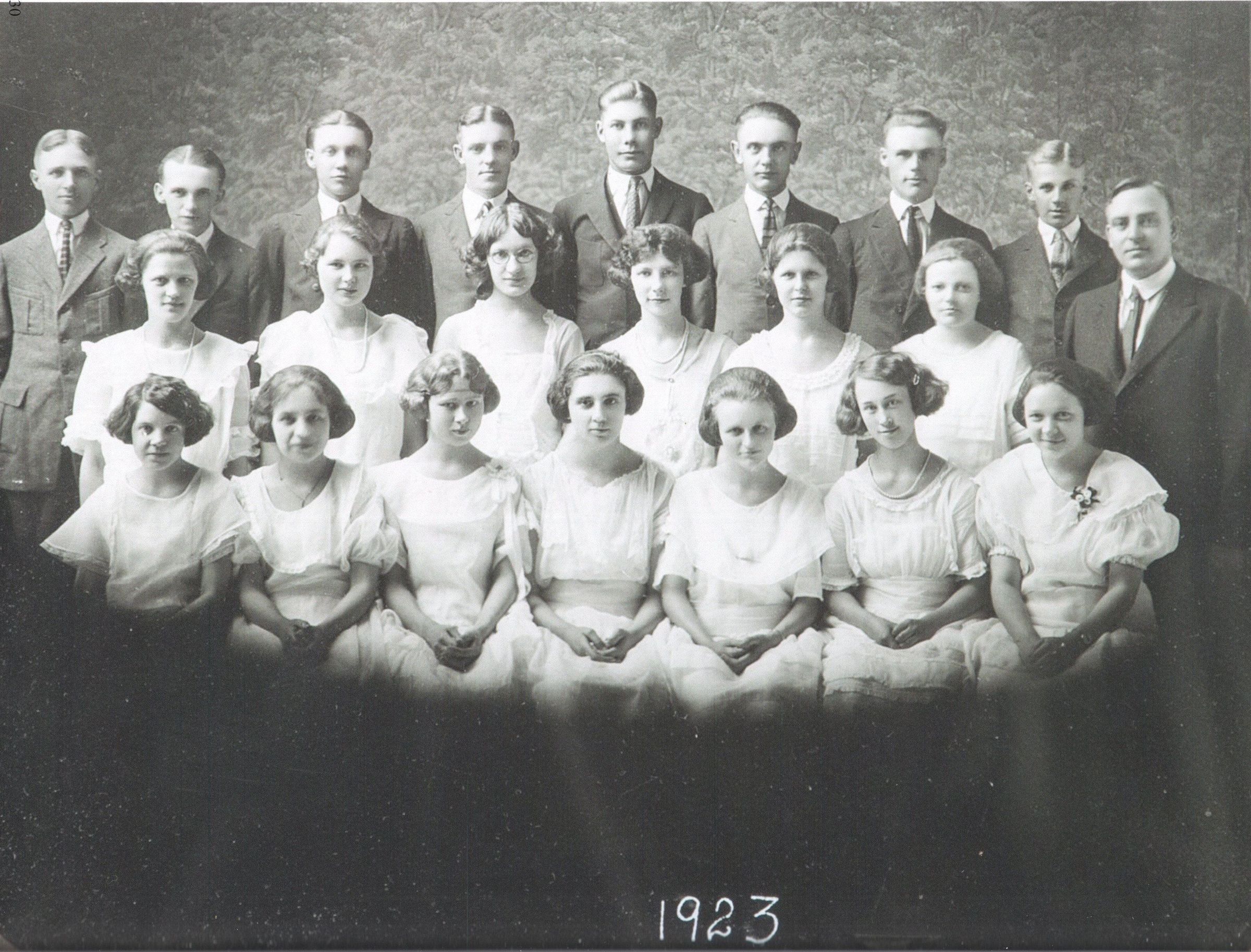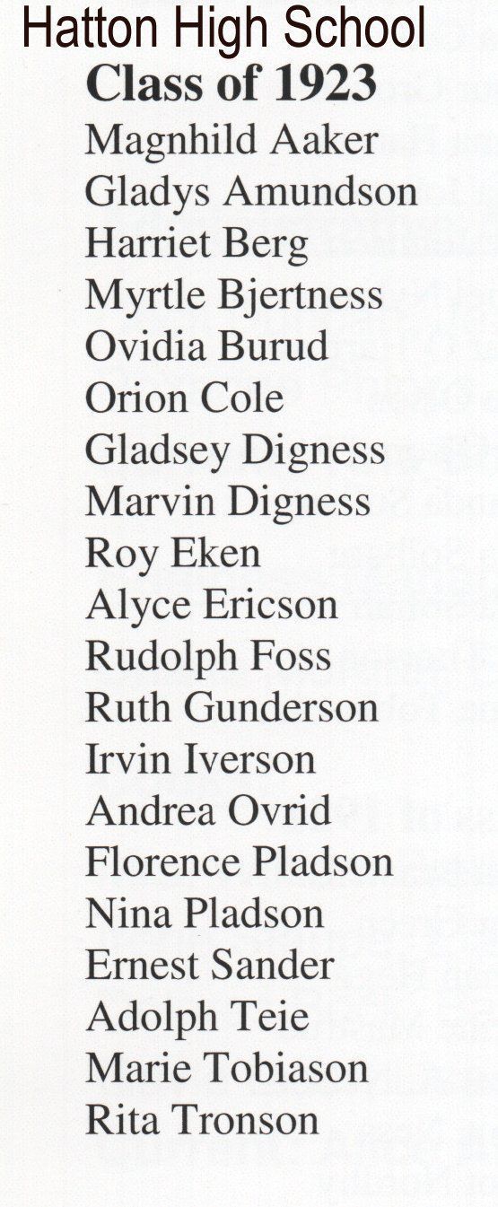 Hatton High School Class of 1923 seniors included: Magnhild Aaker, Gladys Amundson, Harriet Berg, Myrtle Bjertness, Ovidia Burud, Orion Cole, Gladsey Digness, Marvin Digness, Roy Eken, Alyce Ericson, Rudolph Foss, Ruth Gunderson, Irvin Iverson, Andrea Ovrid, Florence Pladson, Nina Pladson, Ernest Sander, Adolph Teie, Marie Tobiason, and Rita Tronson.