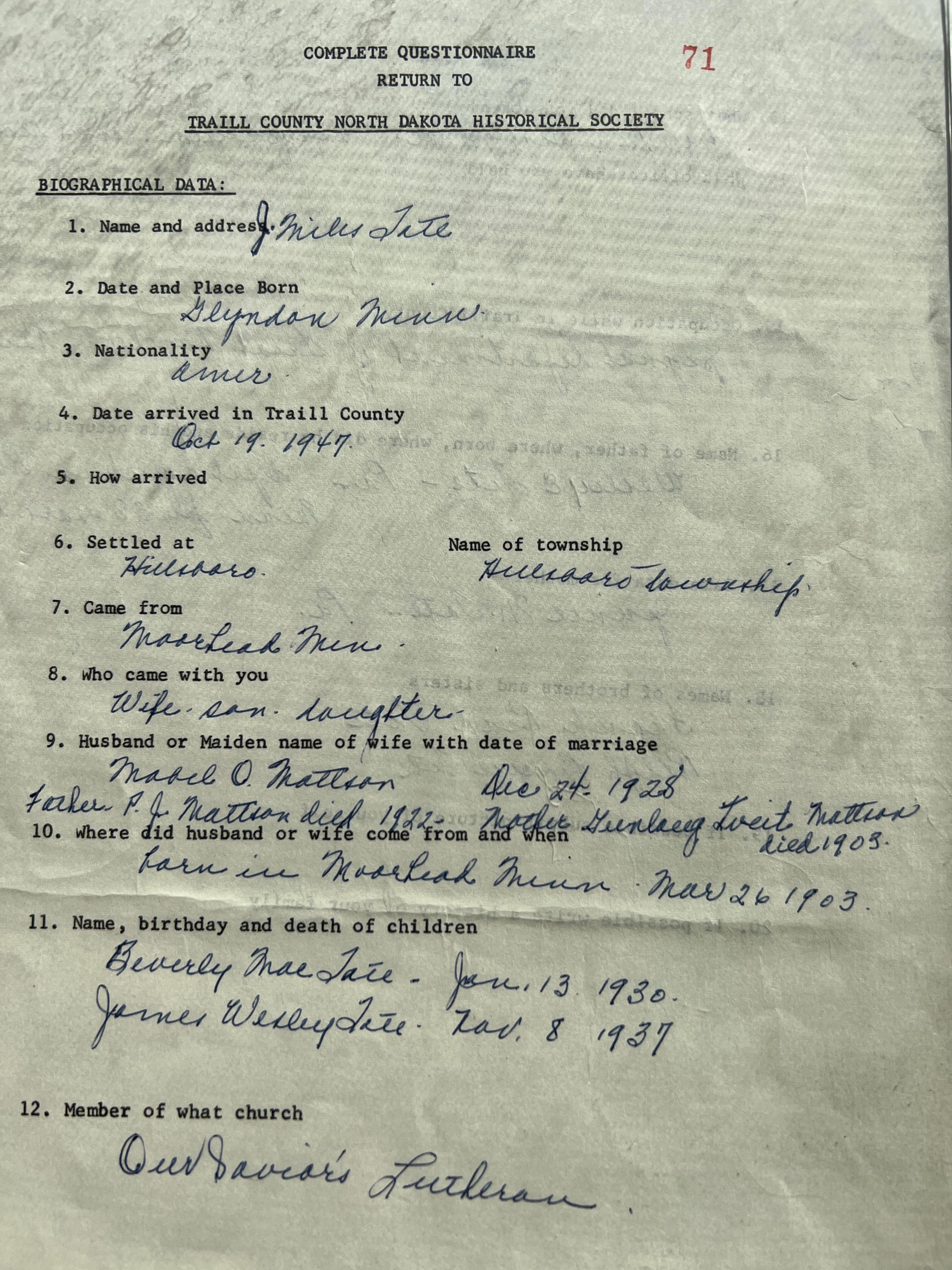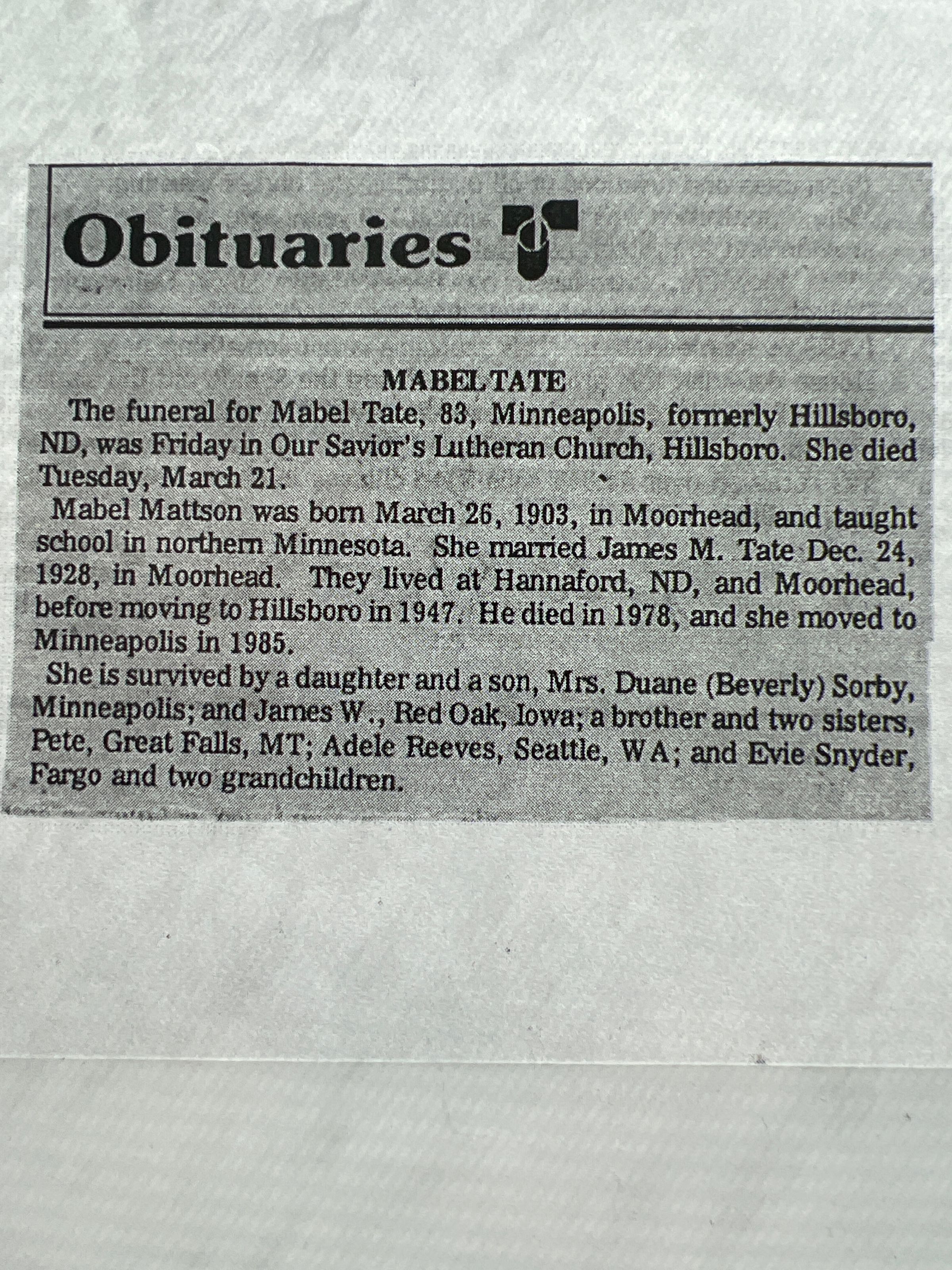A folder of information on the lives of Miles and Mabel (Mattson) Tate of Hillsboro. They married on 24 December 1928 and had two children, including Beverly Mae Tate (born 13 January 1930) and James Wesley Tate (b. 8 November 1937).Cataloged By