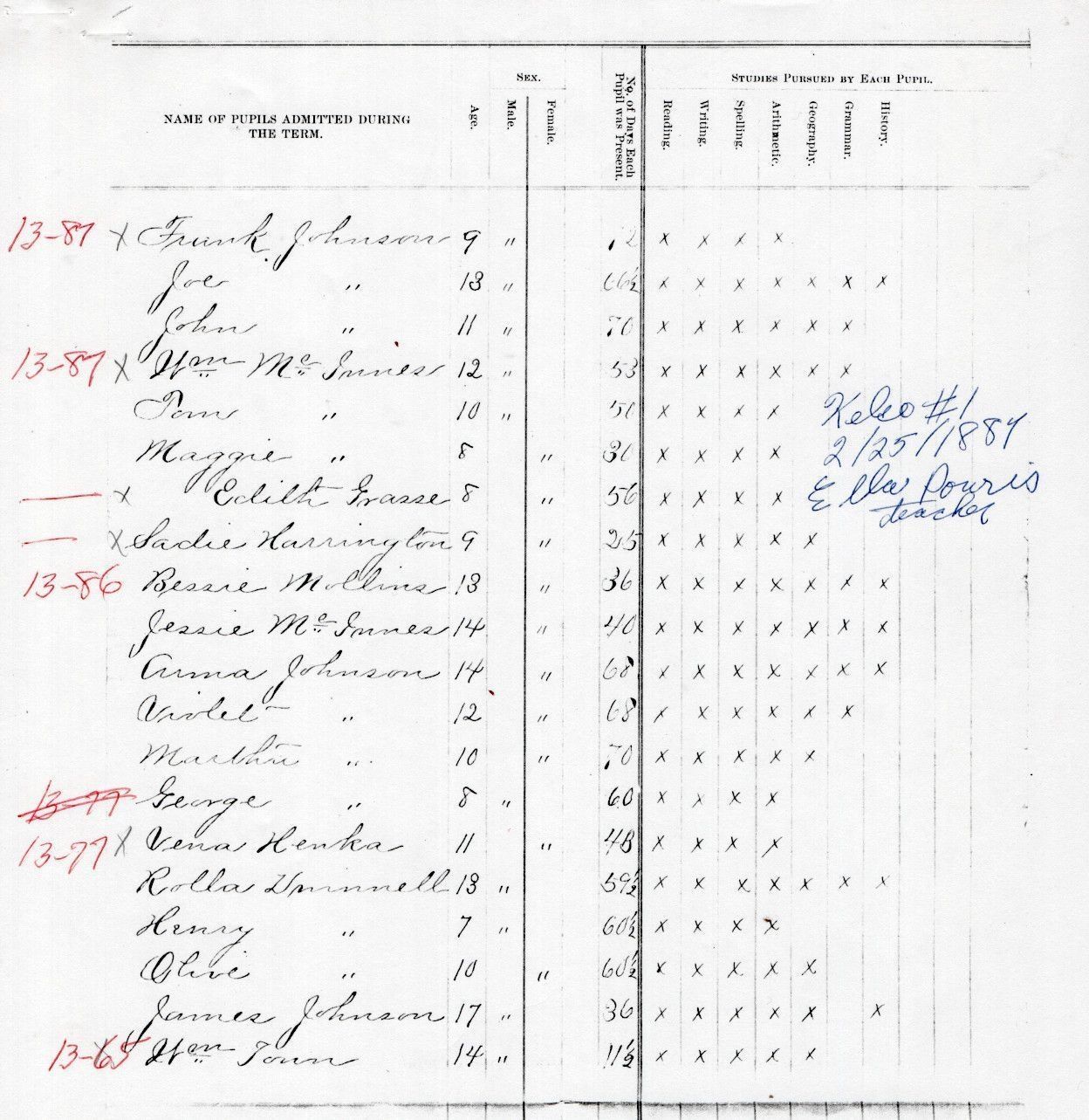 On 25 February 1887, Kelso School No. 1 teacher, Ella Pouris, reported the attendance of 20 students: Henry Darnell, Olive Darnell, Rolla Darnell, Edith Grasse, Sadie Harrington, Vena Henka, Anna Johnson, Frank Johnson, George Johnson, James Johnson, Joe Johnson, John Johnson, Martha Johnson, Violet Johnson, Jesse McInnes, Maggie McInnes, Tom McInnes, Wm McInnes, Bessie Mollins, and Wm Tonn.