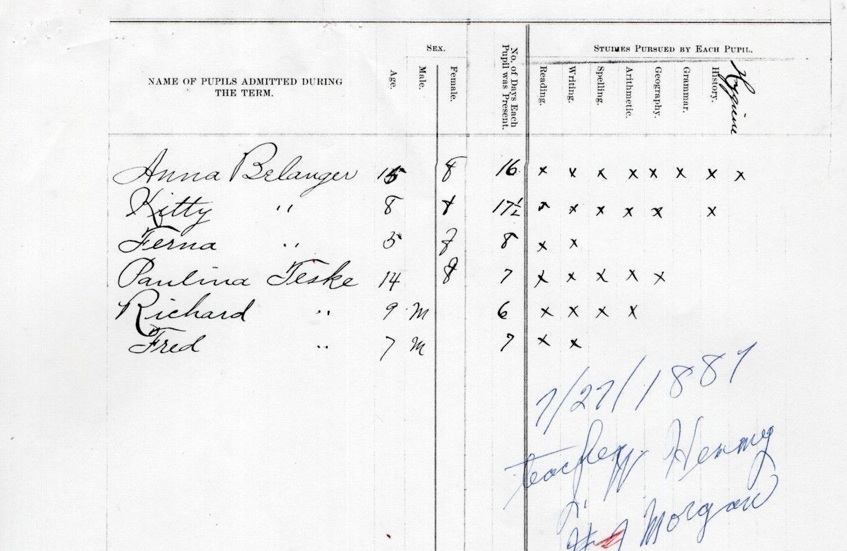 On 27 July 1887, Morgan School No. 1 teacher, J. W. Hemmy, reported the attendance of 6 students: Anna Belanger, Ferna Belanger, Kitty Belanger, Fred Teske, Pauline Teske, and Richard Teske.