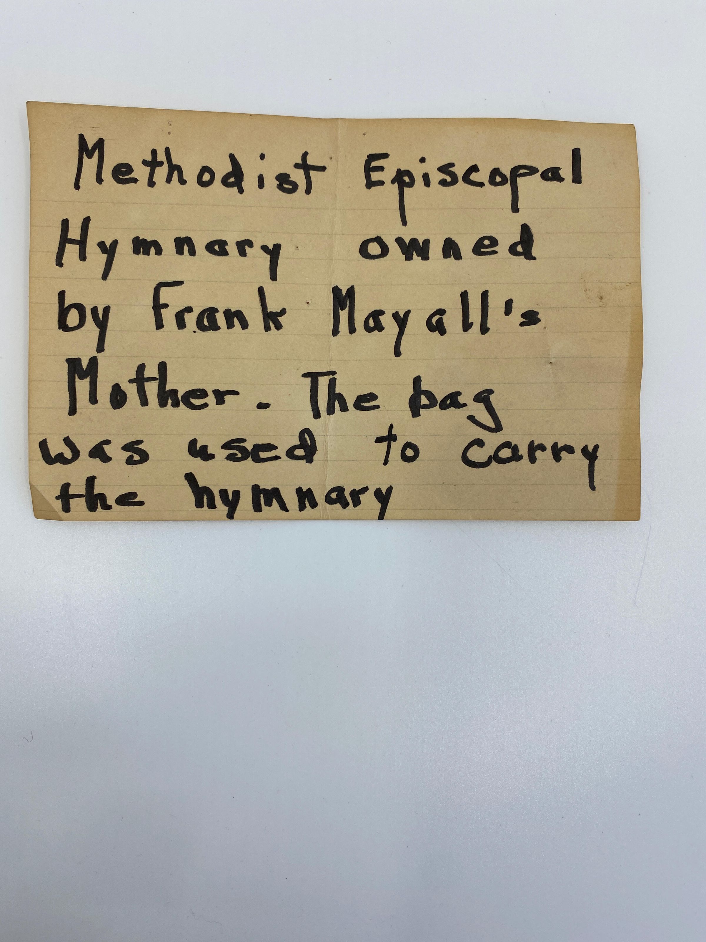 Bag to carry Methodist Episcopal Hymnary. Used by the mother of Frank Mayall when travelling from Maine to Anoka, MN in 1840.Cataloged By
