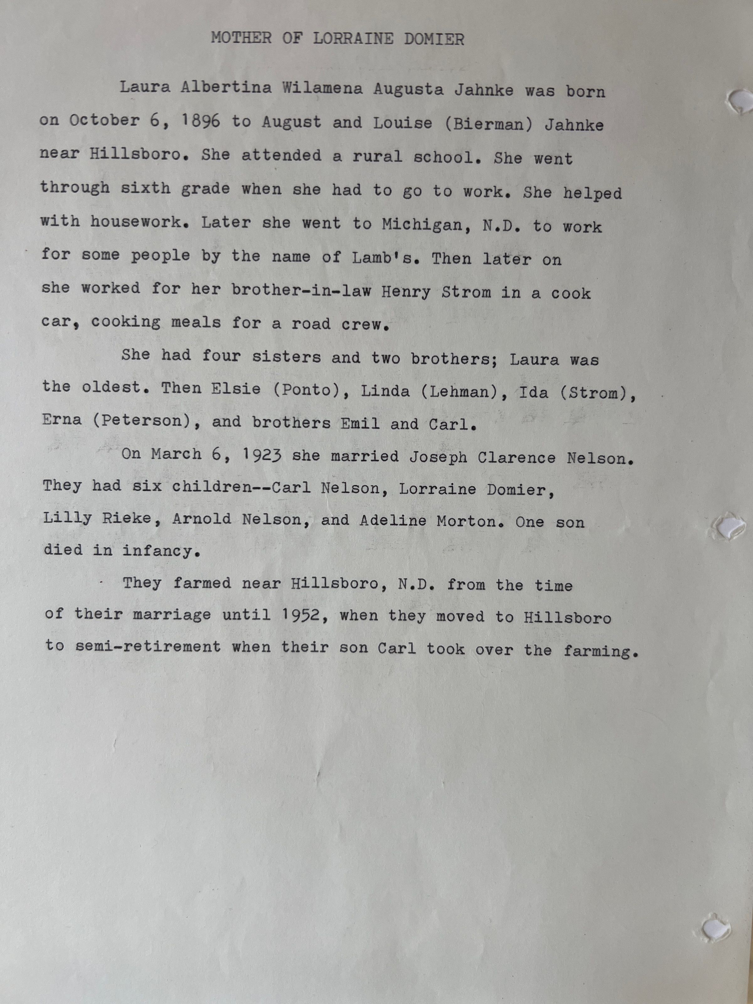 Laura Jahnke married Joseph Nelson in 1923 and farmed near Hillsboro. They had six children, Carl Nelson, Lorraine (Nelson) Domier, Lilly (Nelson) Rieke, Arnold Nelson, Adeline (Nelson) Morton, and a son that died in infancy.