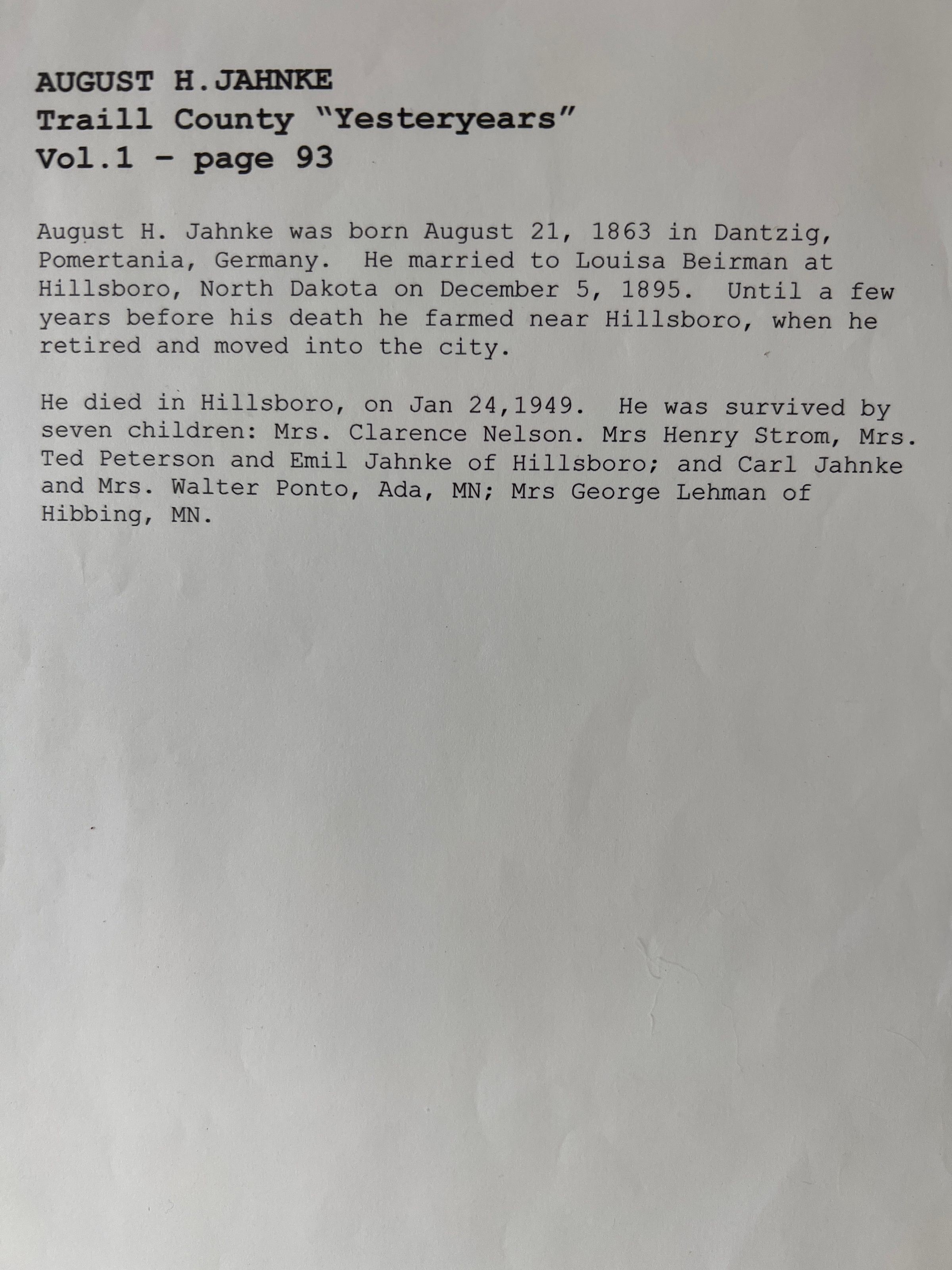 This page also contains a page on August Jahnke from Traill County "Yesteryears"Acquisition