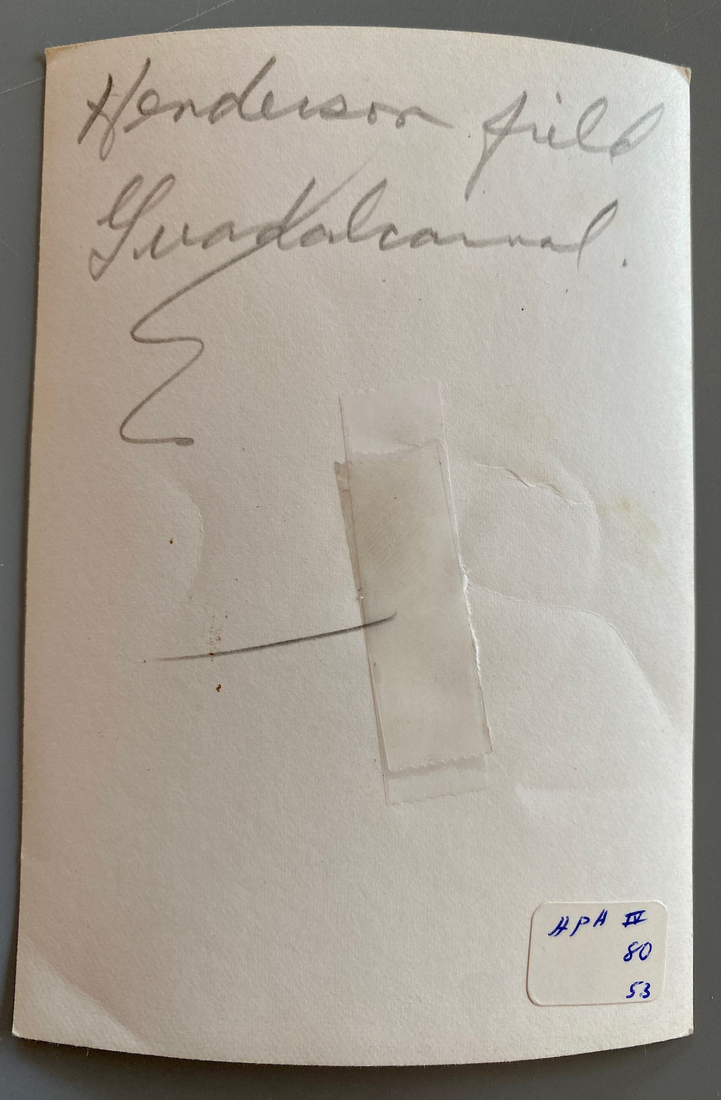 A photograph of WWII fighter planes parked on Henderson Field on Guadalcanal in the Soloman Islands, South Pacific. Henderson Airfield was a WWII base originally built in April 1942 by the Japanese on Guadalcanal Island, and the battle over its possession was one of the great battles in the South Pacific (Wikipedia). Allied forces took Henderson Field from the Japanese in August 1942, who made several failed attempts to retake Henderson Field.Cataloged By