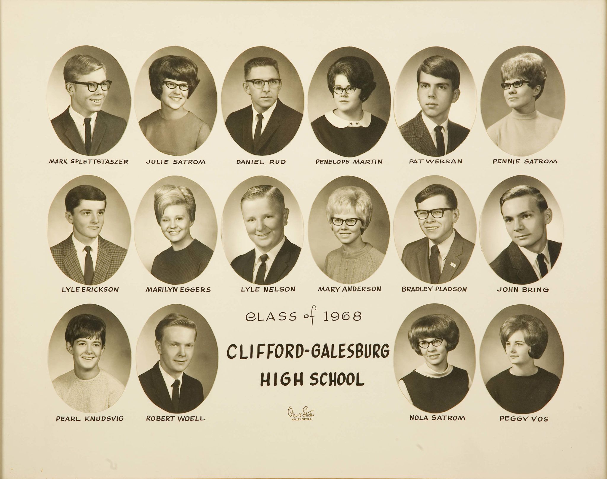A photograph of the Clifford-Galesburg High School Class of 1968 included photos of 16 graduating seniors: Mary Anderson, John Bring, Marilyn Eggers, Lyle Erickson, Pearl Knudsvig, Penelope Martin, Lyle Nelson, Bradley Pladson, Daniel Rud, Julie Satrom, Nola Satrom, Pennie Satrom, Mark Splettstaszer, Peggy Vox, Pat Werran, and Robert Woell.