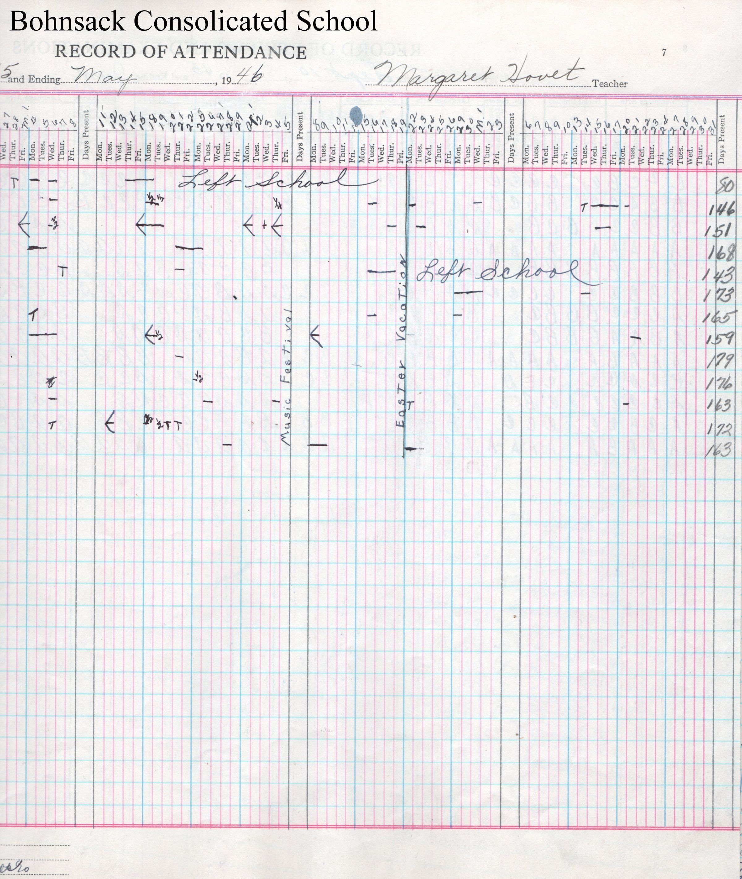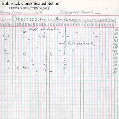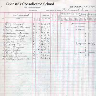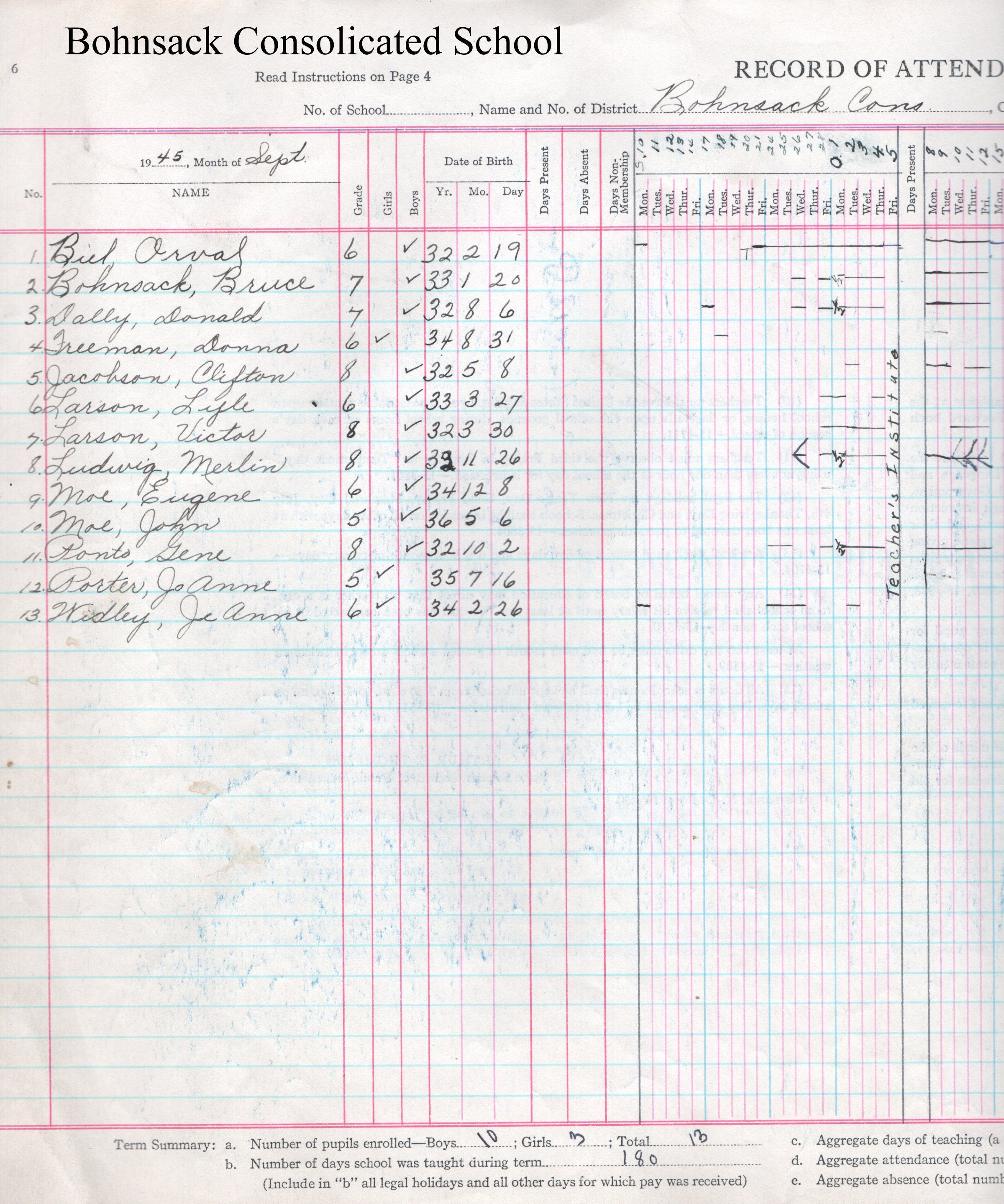 During the 1945-66 school year, Bohnsack Consolidated teacher Margaret Hovet recorded the attendance of students in her grades 5 to 8 classes. Students included Orval Biel, Bruce Bohnsack, Donald Dally, Donna freeman, Clifton Jacobson, Lyle Larson, Victor Larson, Merlin Ludwig, Eugene Moe, John Moe, Gene Ponto, JoAnne Porter and JeAnne Widley.Acquisition