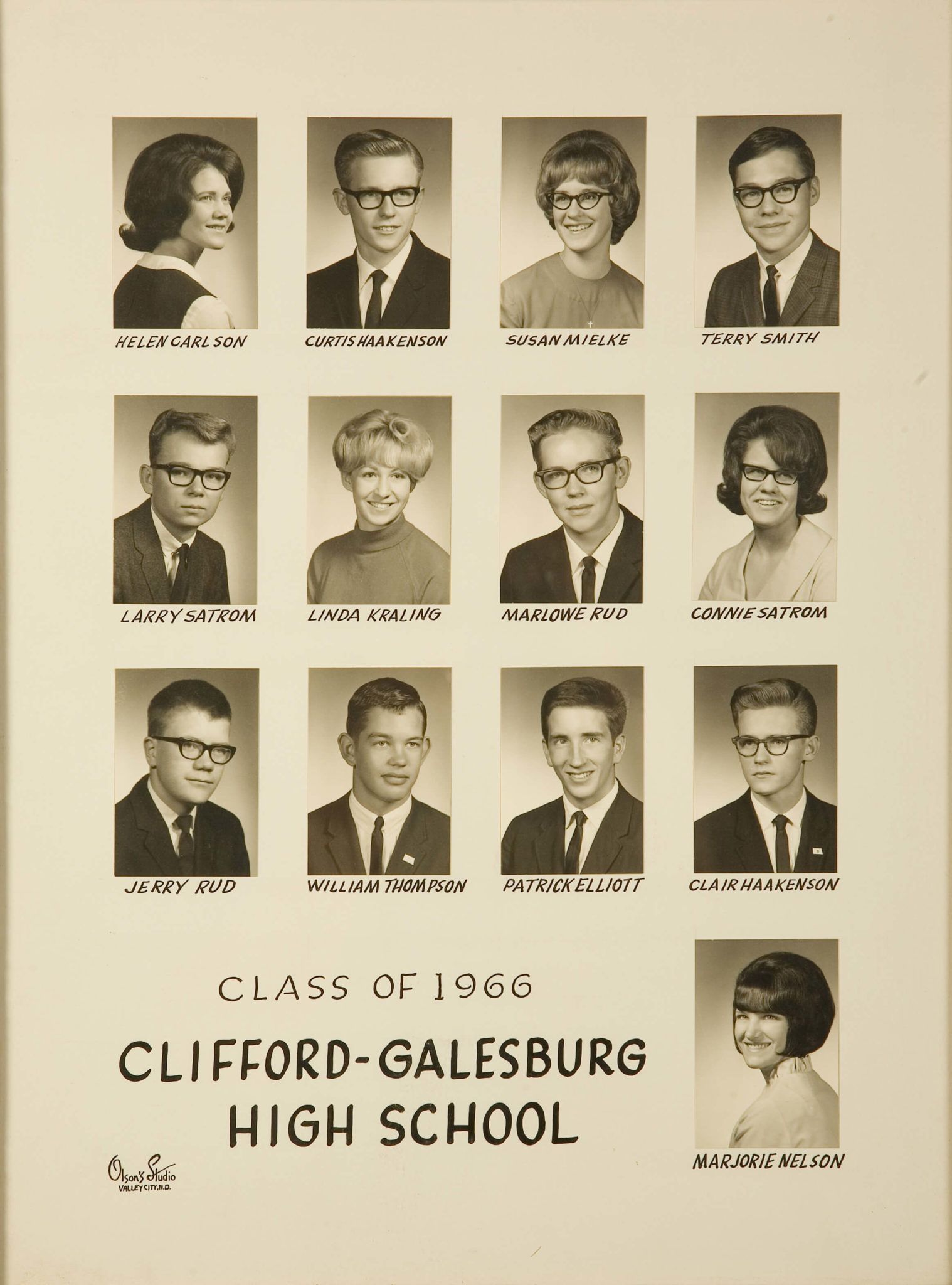 A photograph of the Clifford-Galesburg High School Class of 1966 included photos of 13 graduating seniors: Helen Carlson, Patrick Elliott, Clair Haakenson, Curtis Haakenson, Linda Kraling, Susan Mielke, Marjorie Nelson, Jerry Rud, Marlowe Rud, Connie Satrom, Larry Satrom, Terry Smith, and William Thompson.