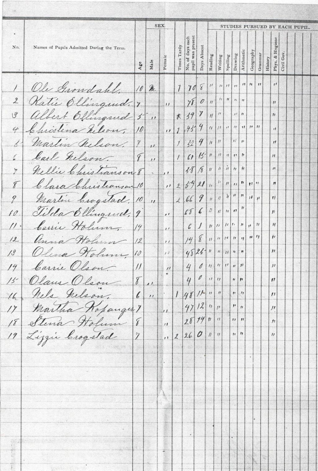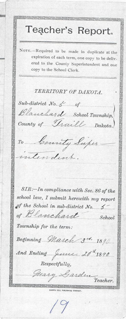 In the 1890 Spring Term (3 Mar-20 Jun), Blanchard School No. 5 teacher Mary Garden reported attendances and studies pursued for 19 students, including Clara Christenson, Nellie Christenson, Martha Copanger, Lizzie Crogstad, Martin Crogstad, Albert Ellingrud, Katie Ellingrud, Tilda Ellingrud, Ole Grondahl, Annie Holum, Carrie Holum, Olena Holum, Stena Holum, Carl Nelson, Christina Nelson, Martin Nelson, Nels Nelson, Carrie Olson, and Olaus Olson.