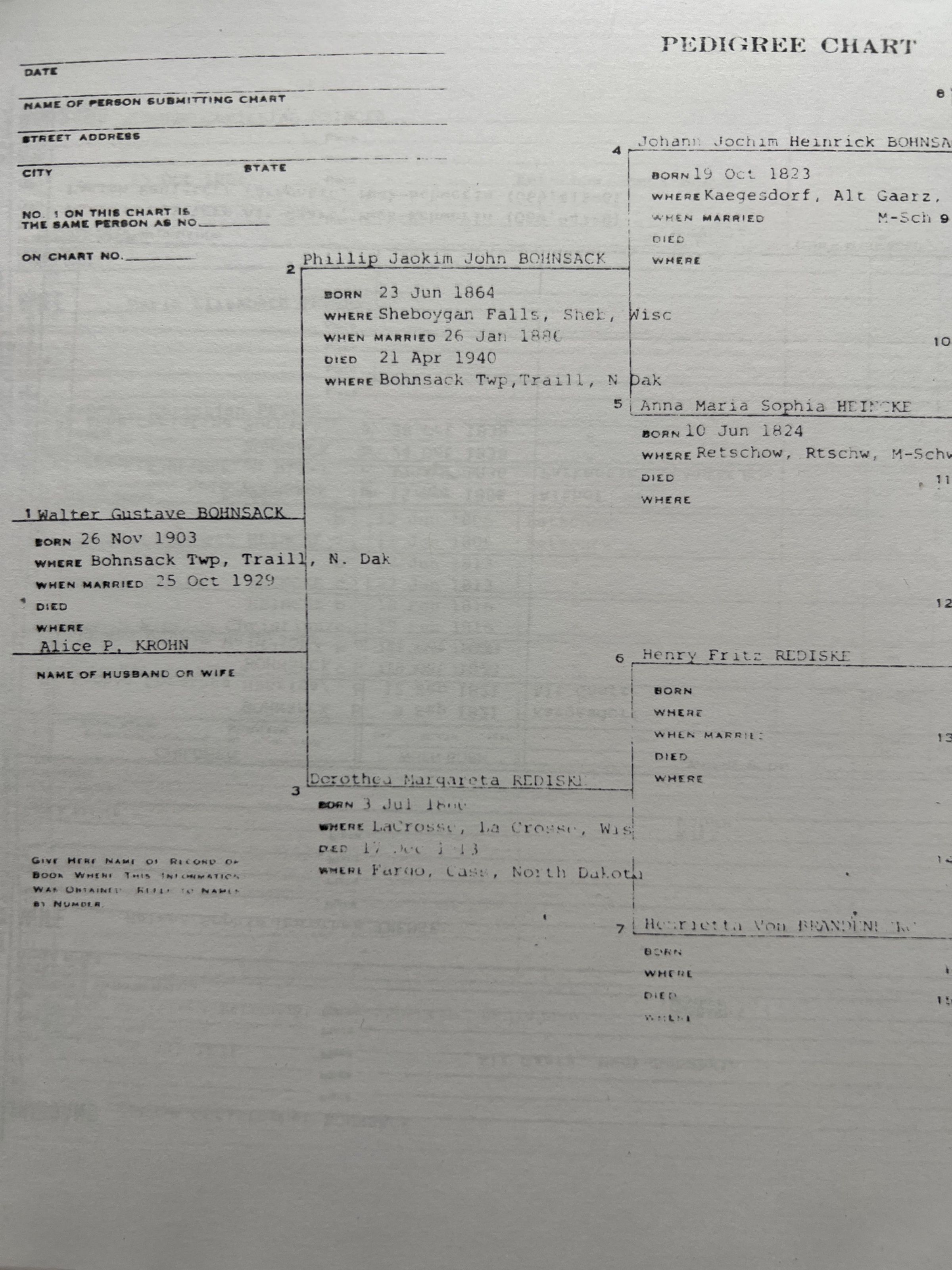 This folder contains a 37-page family history document written by Walt Bohnsack, which describes his German heritage, his boyhood recollections of his grandfather, Johann (John) Bohnsack, and his life growing up on his parents Phillip and Dorothea (Rediske) Bohnsack's farm in Section 14 in Bohnsack Township. This folder also has genealogical family group sheets and a pedigree chart.