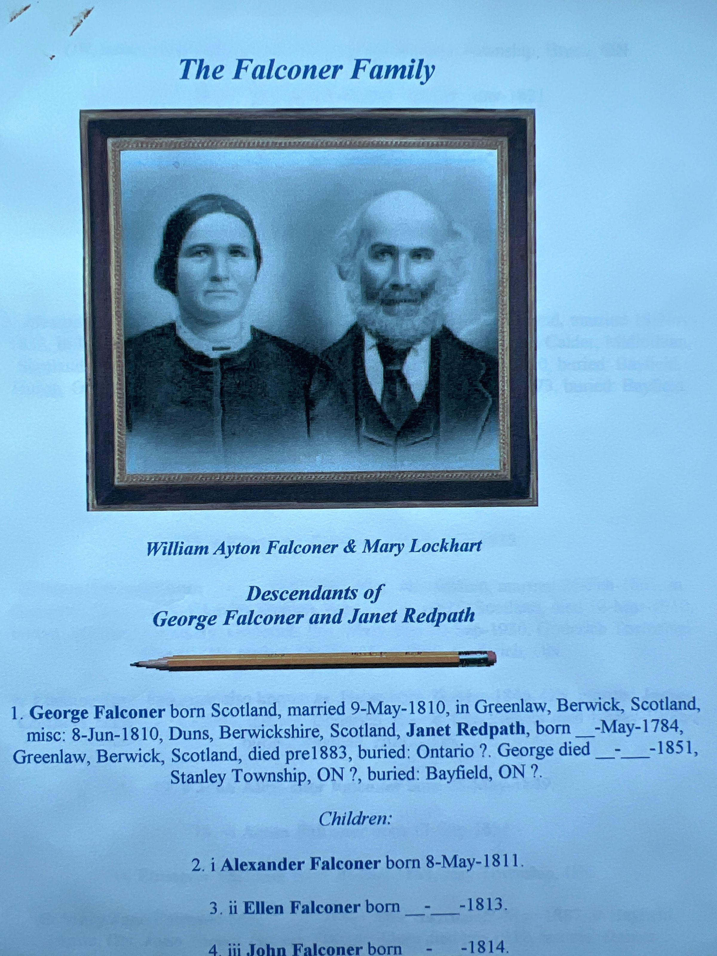 This family folder has a booklet on the descendants of George Falconer (1810 - 1851) and Janet Redpath Falconer. A number of their descendants, such as John and Margaret Falconer, homesteaded in the Elm River and Quincy area of Traill County, Dakota Territory.Cataloged By