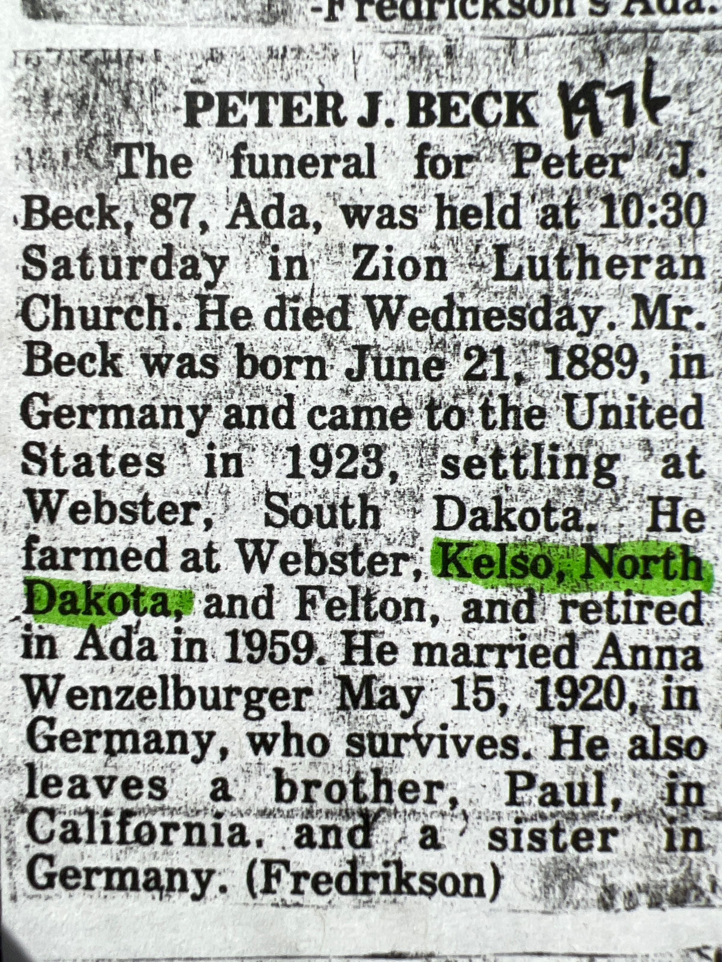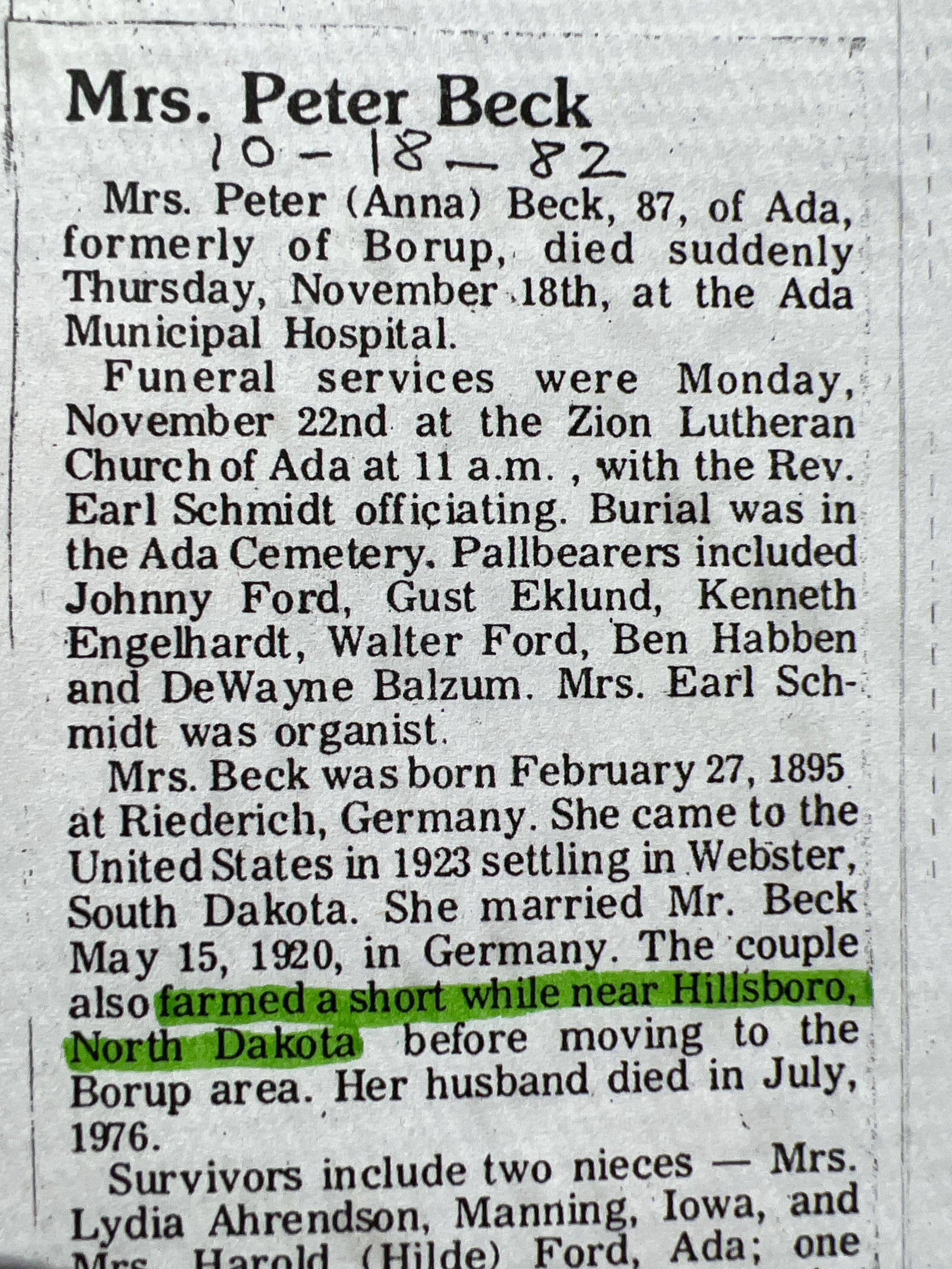 A file of obituaries for Peter and Anna (Wenzelburger) Beck, who farmed in Hillsboro Township, Traill County, ND, near Kelso, in the late 1920s and early 1930s. As described in another obituary, in 1951, Anna's niece, Hilde Gauss, came from Germany to live with Peter and Anna, who were then farming by Borup, MN. Hilde Gauss married Harold Ford of Ada, MN.Cataloged By