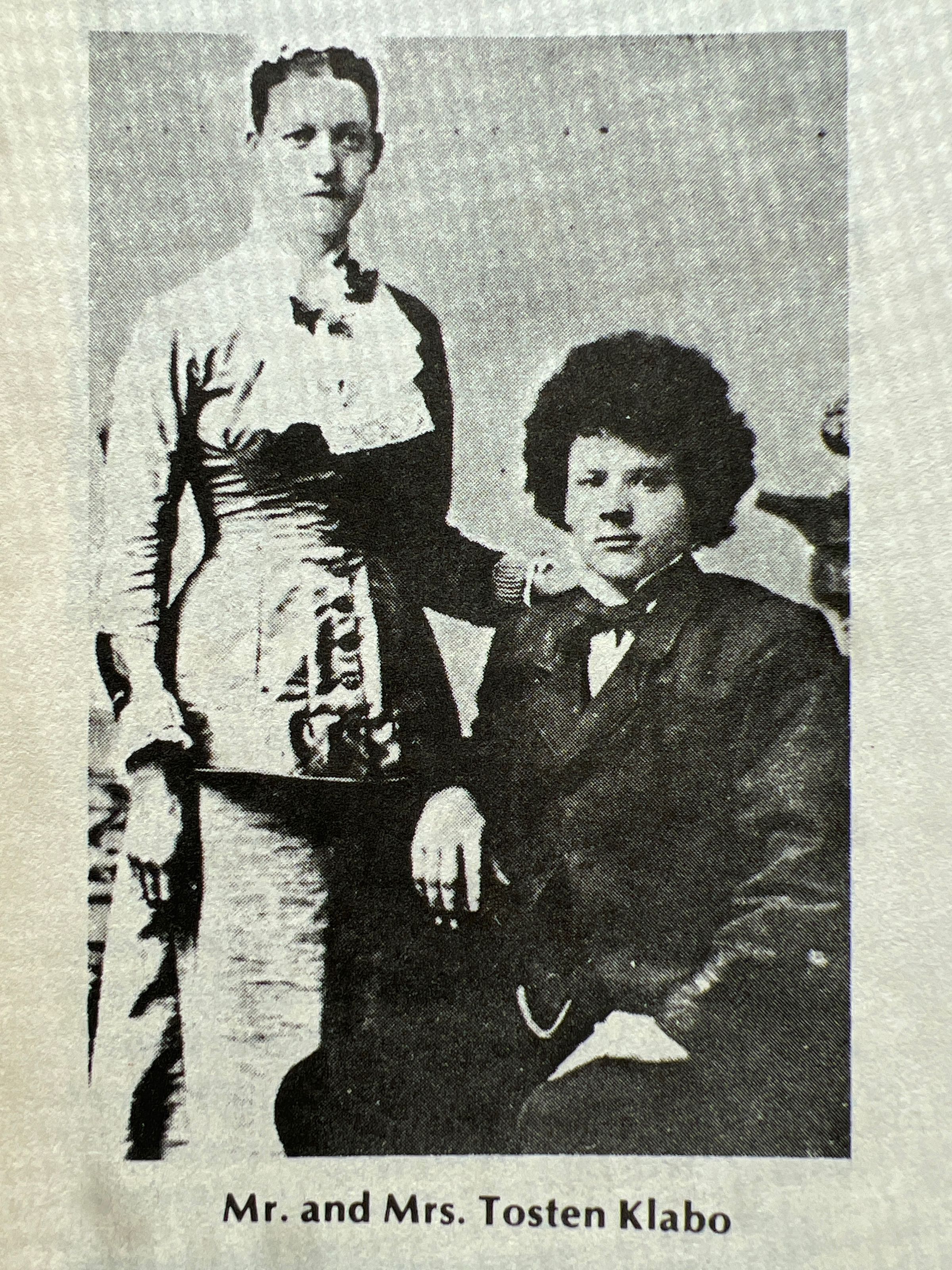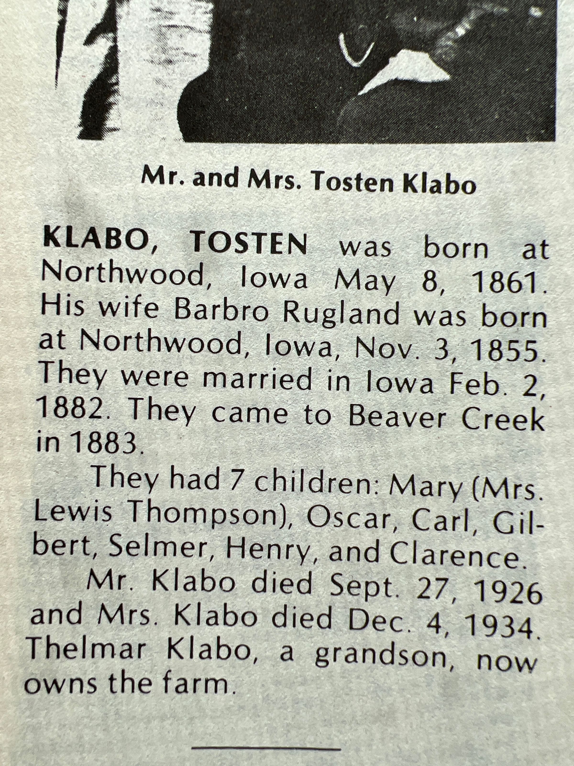 This file has information from the Hatton Centennial (1884-1984) book, A Century of Change, on the Tosten and Barbro (Rugland) family. They had six children, Mary Klabo (Mrs Lewis Thompson), Oscar Klabo, Carl Klabo, Gilbet Klabo, Selmer Klabo, Henry Klabo, and Clarence Klabo.Cataloged By