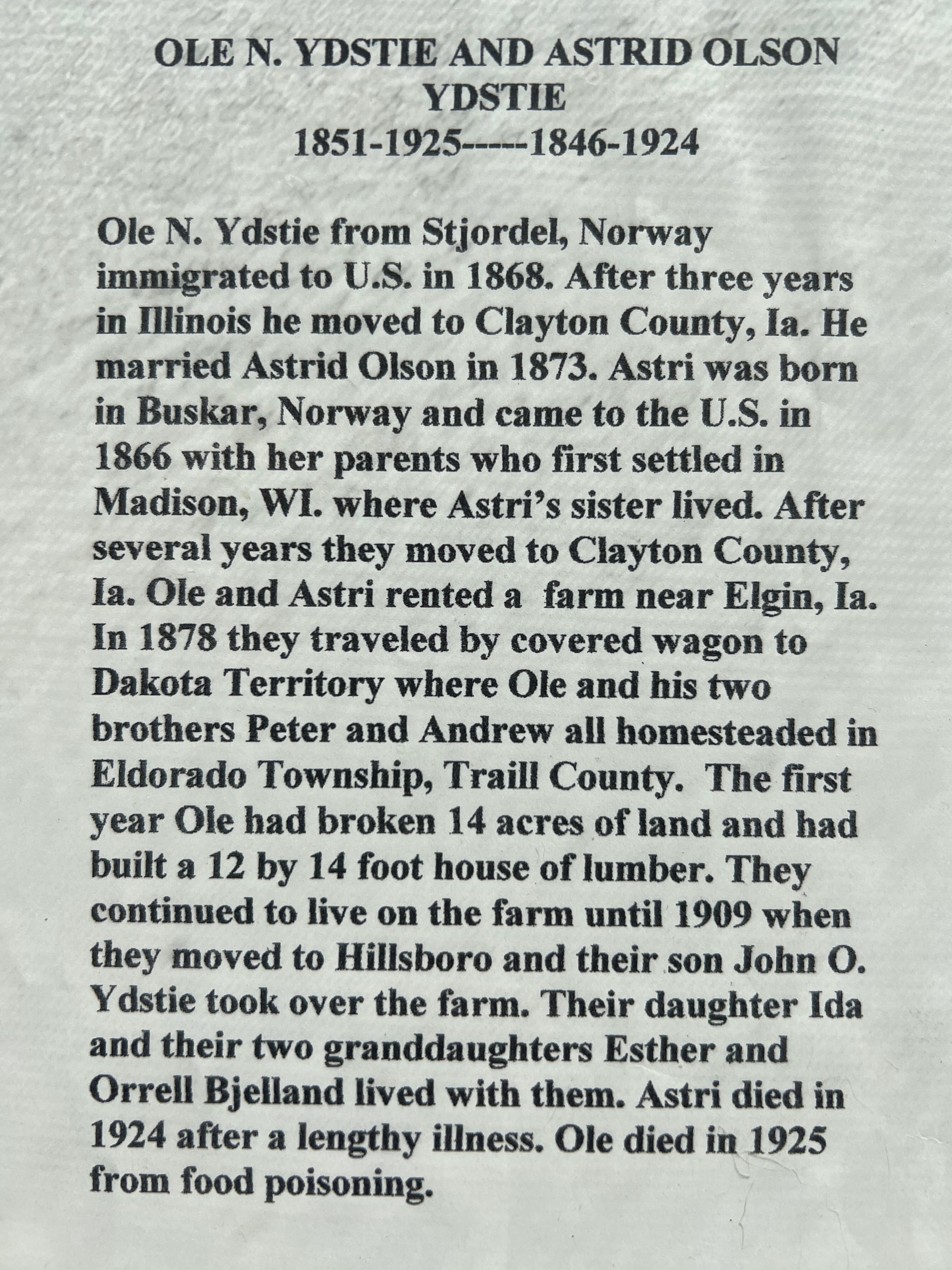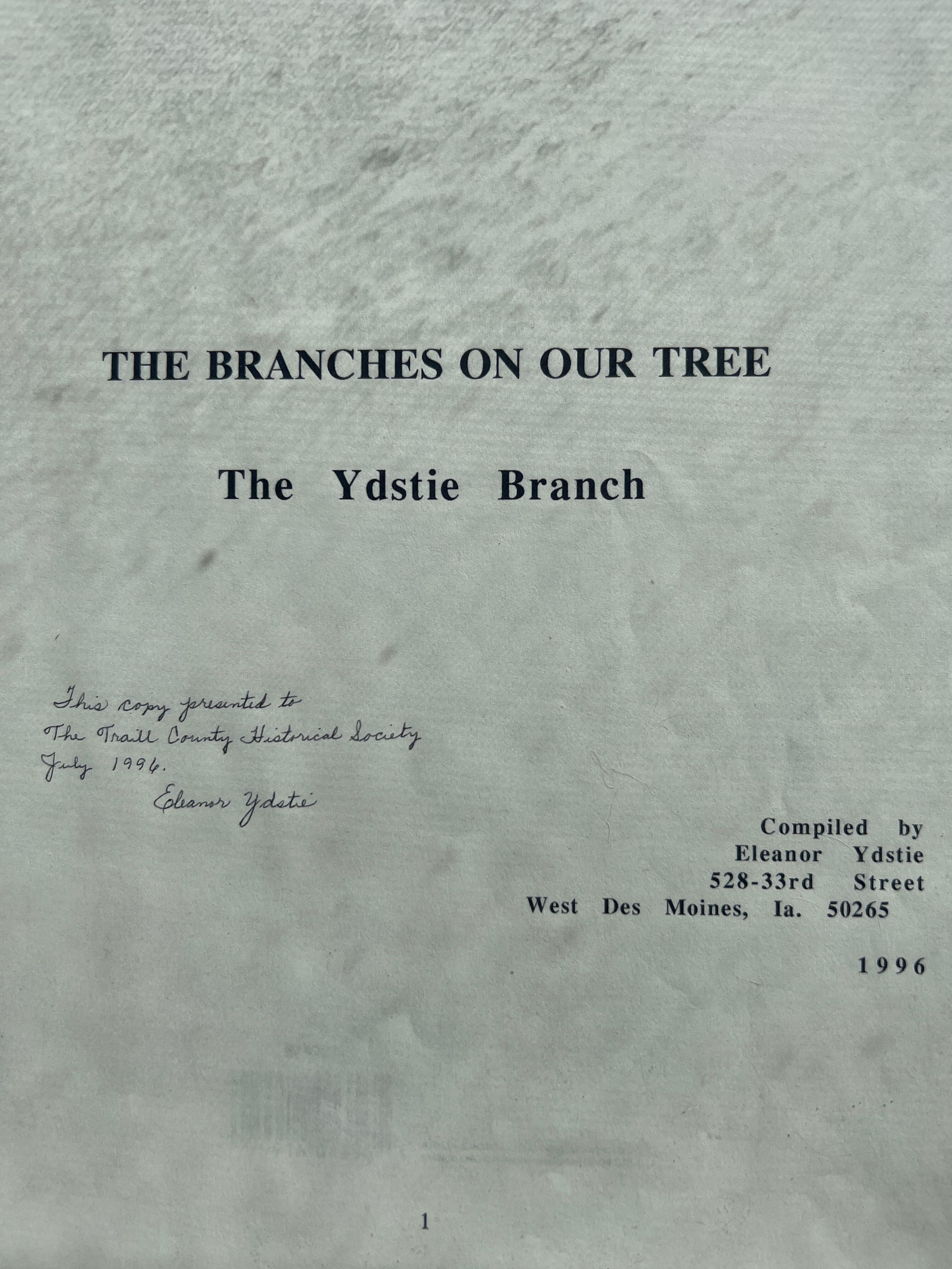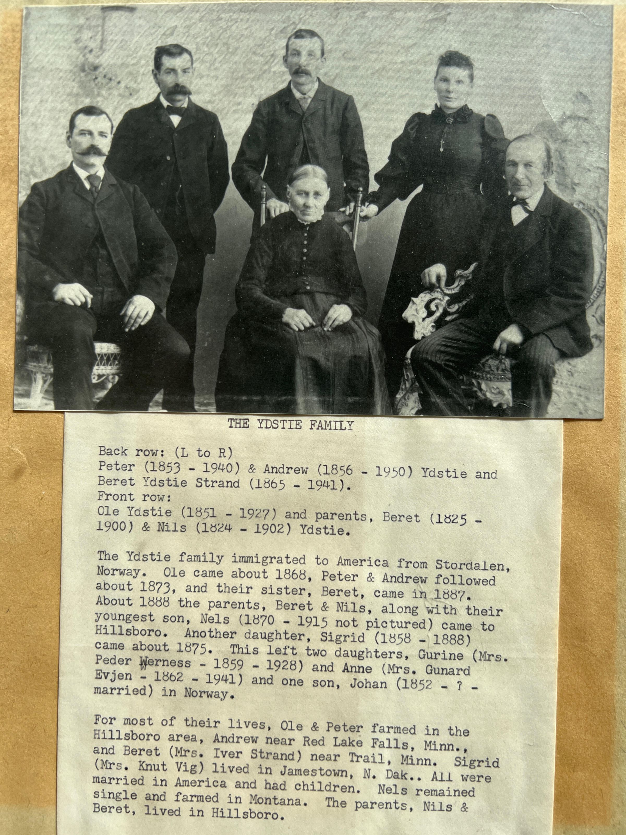 A folder and ring-binder of information on Nils and Beret (sorte) Ydstie and their descendants. The folder contains a photograph of the Ydstie family and information on Ole and Astrid (Olson) Ydstie donated by Mrs. O. Jerome Madson. In 1878, Ole homesteaded in Eldorado Township, along with his brothers Peter and Andrew Ydstie. The folder also has 2001 results from Ancestry.com searches and correspondence by Geraldine Mohn. The ring-binder documents numerous Ydstie family trees compiled, written and donated to the TCHS in 1996 by Eleanor Ydstie.Cataloged By