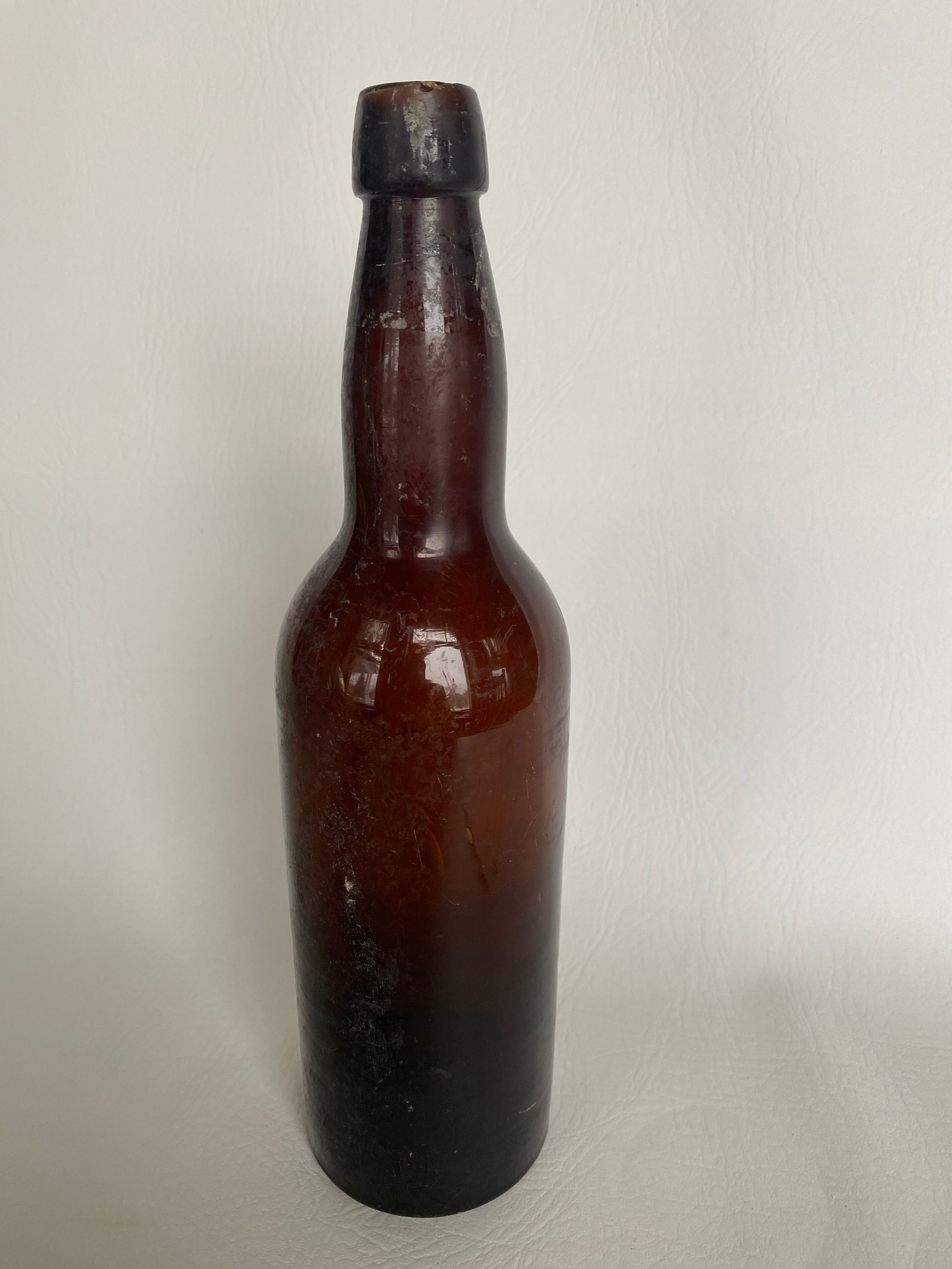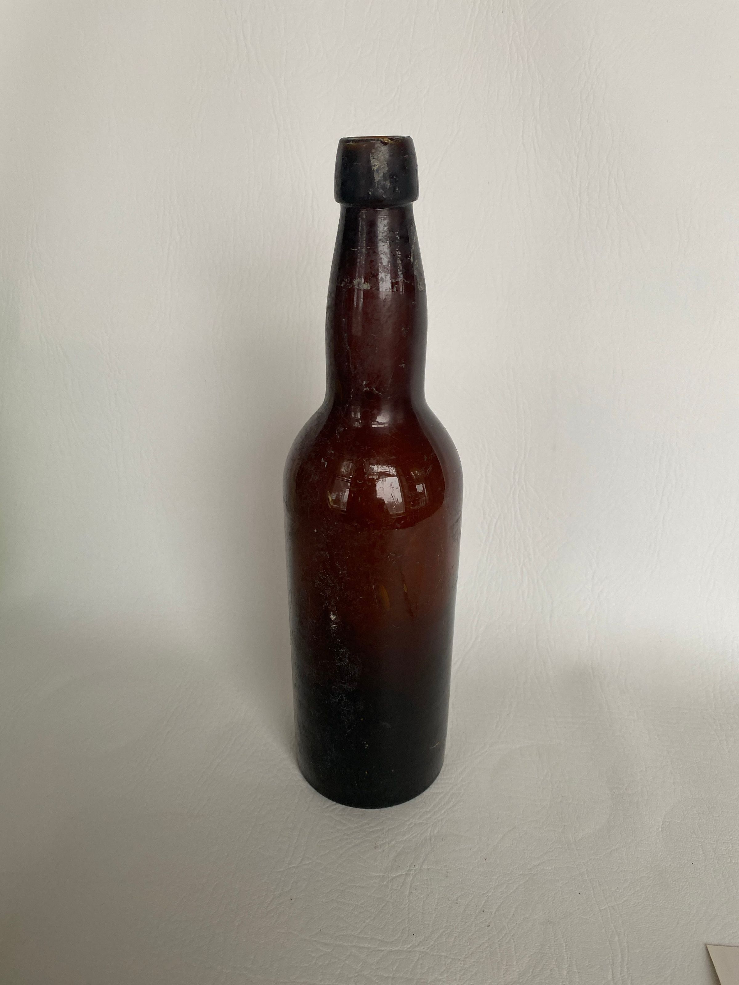 Amber Beer Bottle - This bottle has been blown into a mold and then was turned in the mold to remove any trace of seam line.Cataloged By