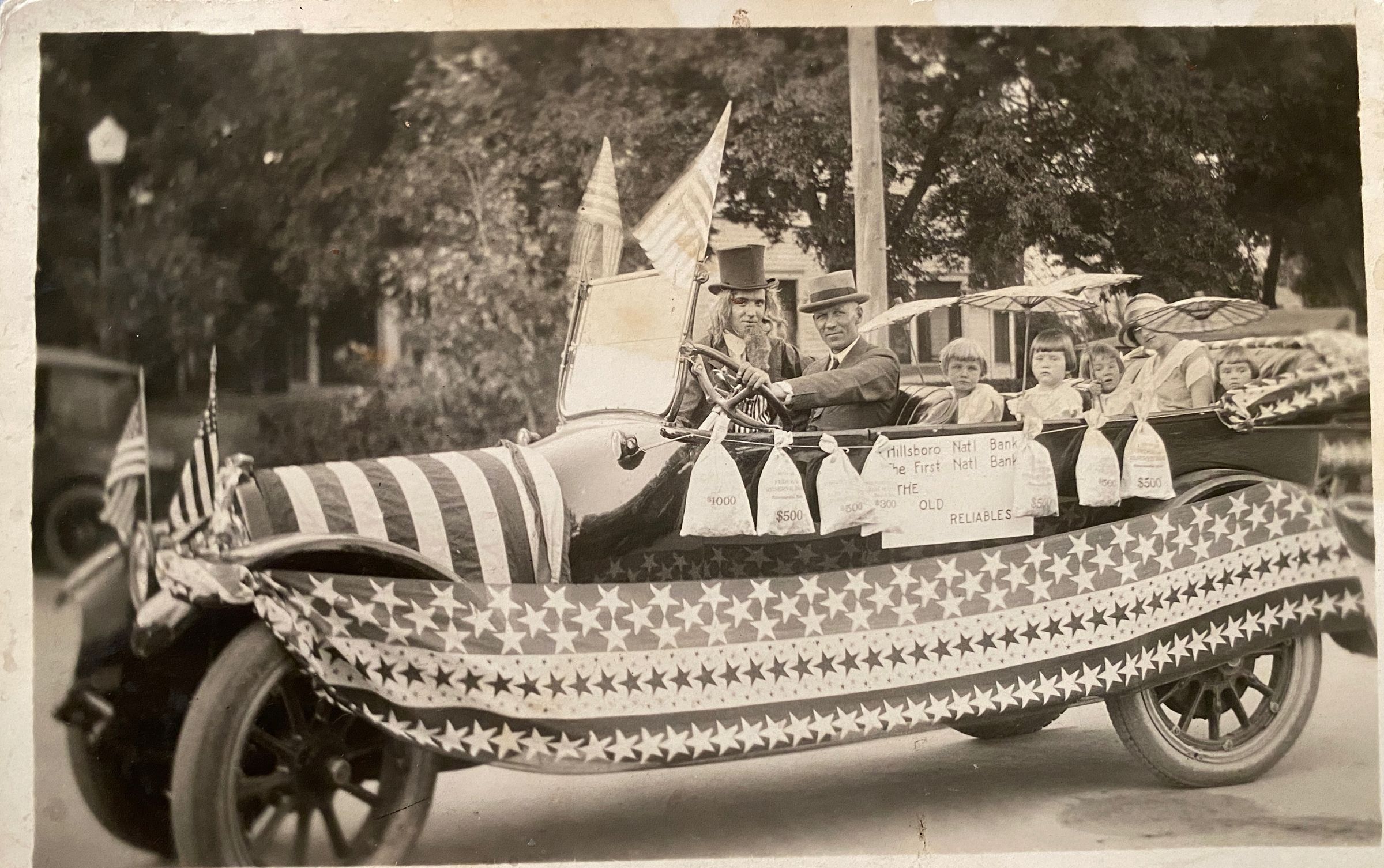 Palmer (Uncle Sam) & Julius Rudrud - National Bank Parade Float. Car owned by Julius.Cataloged By