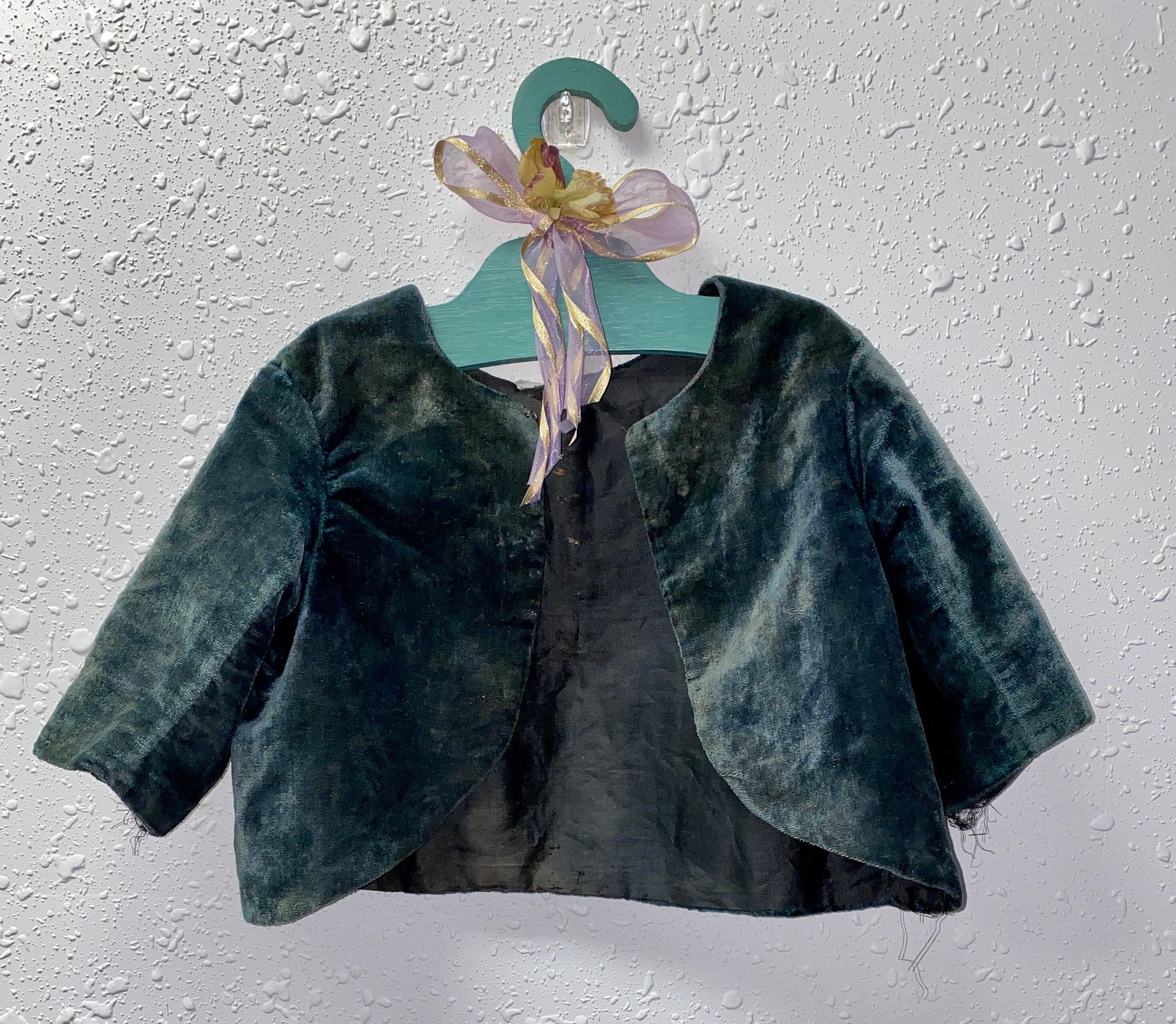 Green velvet baby jacket worn by Aaron Sheritt who was born in 1897. He resided three miles south of Blanchard.Cataloged By