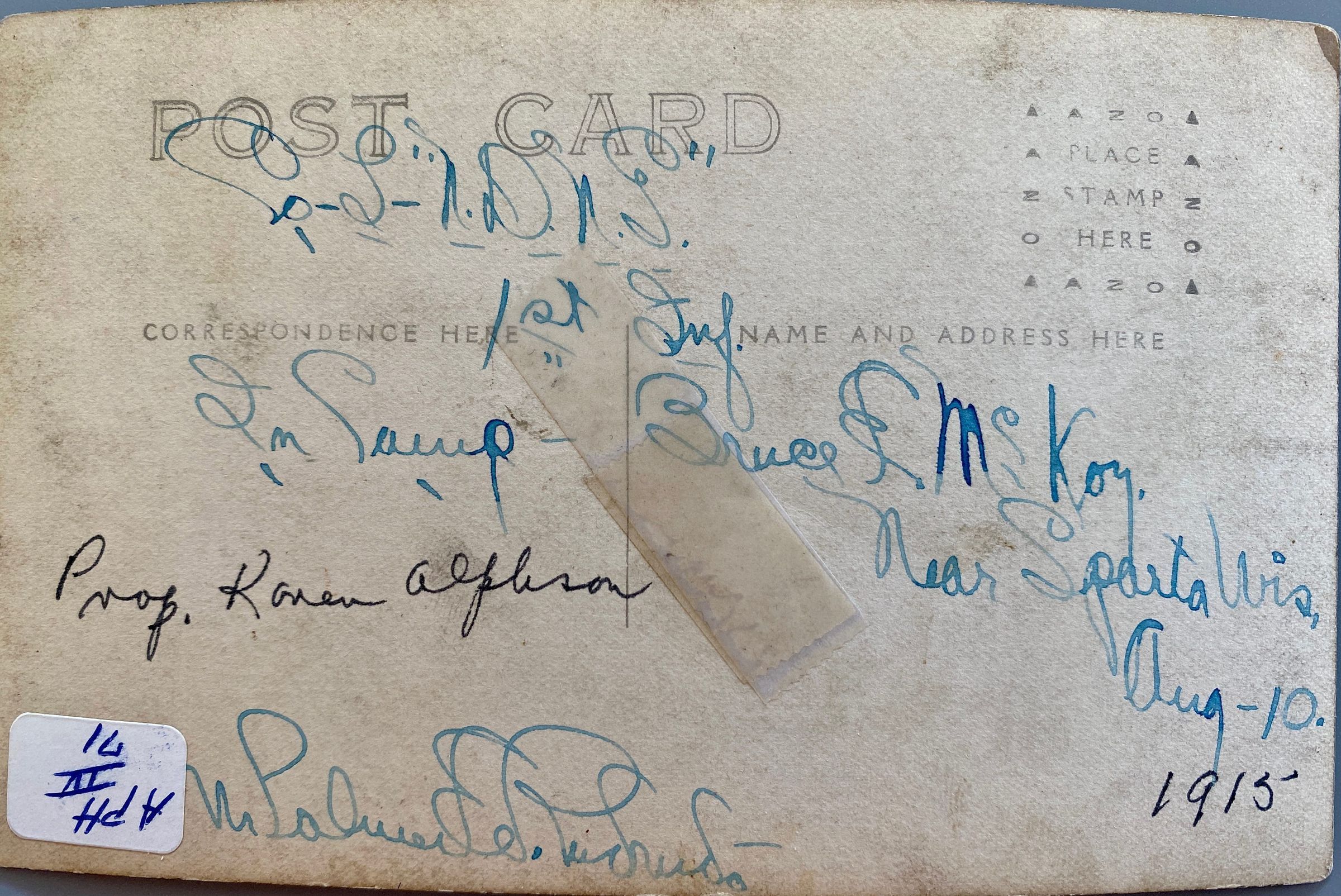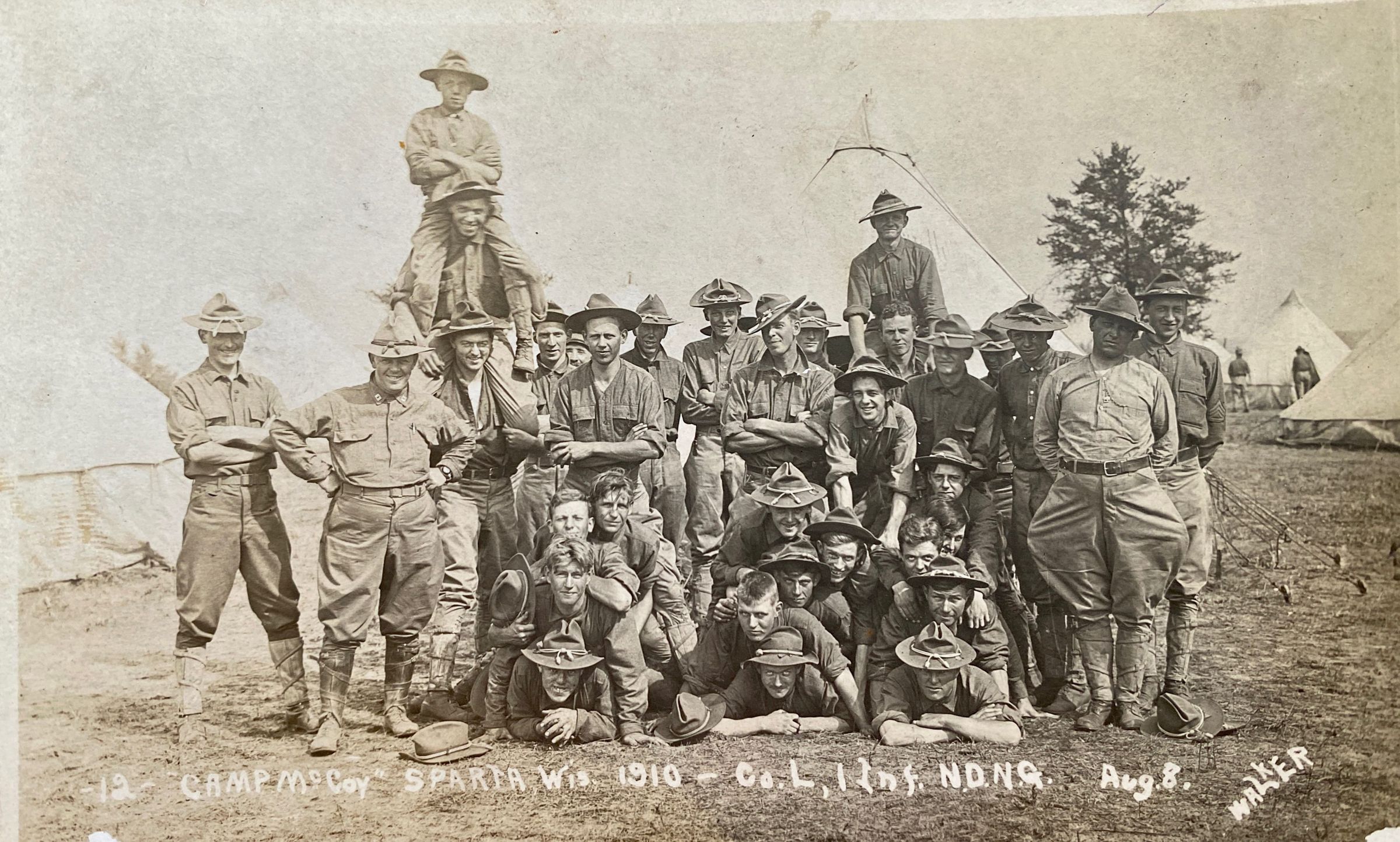 Traill County, ND, National Guard Company L at Camp McCoy, Sparta, WI. Photo date: 10 August 1915. From the Palmer Rudrud Postcard Collection.Cataloged By