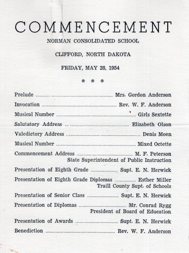 On 26 May 1954, the Commencement program for Eighth Grade and High School graduates from Norman Consolidated School was held in Clifford, ND. The program began with a Prelude and ended with a Benediction.Acquisition
