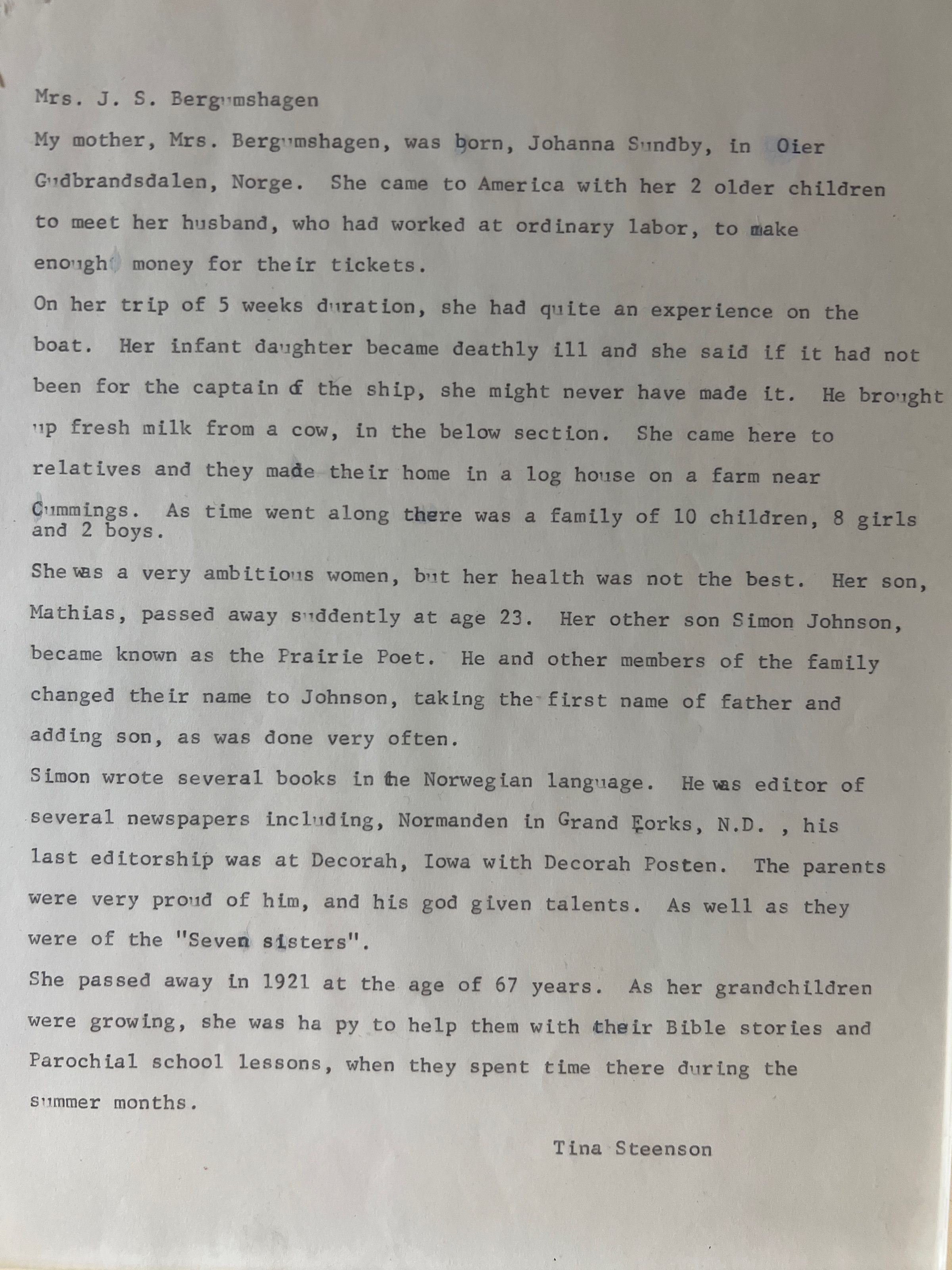 Johanna and Johannes had ten children, eight girls and two boys, including Simon a 'Prairie Poet' and editor for Norwegian newspapers out of Decorah, Iowa.