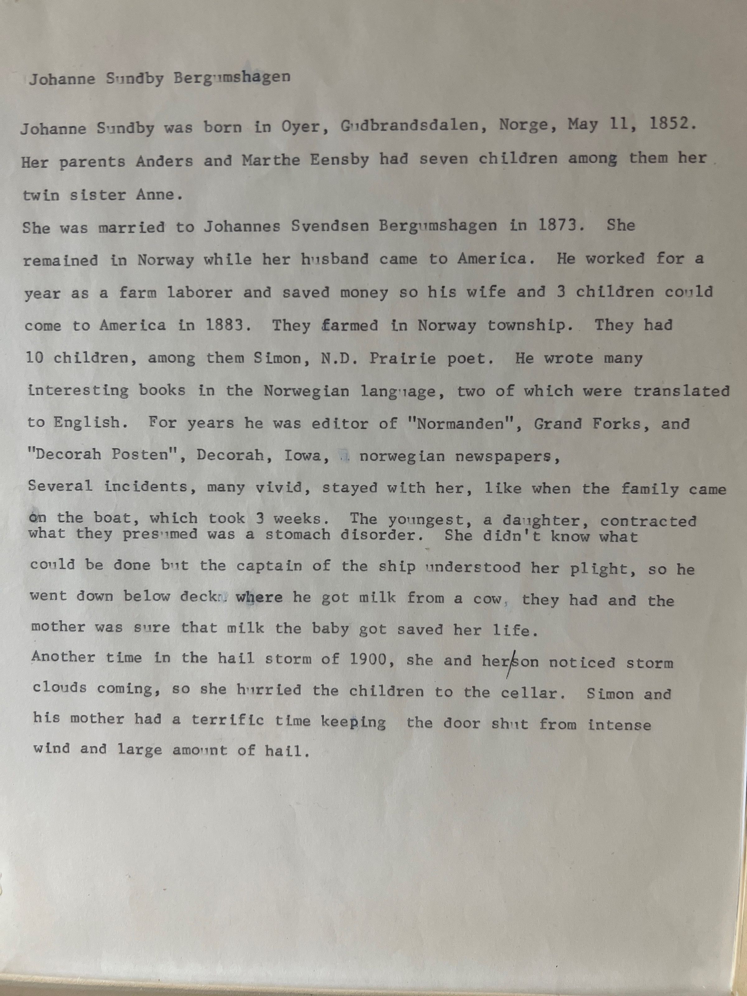 This folder contains two pages describing the life of Johanna Sundby, who was born in 1852 in Norway. In 1873, Johanna married Johannes Bergumshagen in Norway where they had three children. Johannes first came to the USA where he worked as a farm labourer to earn enough money to bring Johanna and children to the USA in 1883. They settled and farmed in Norway Township in Traill County.