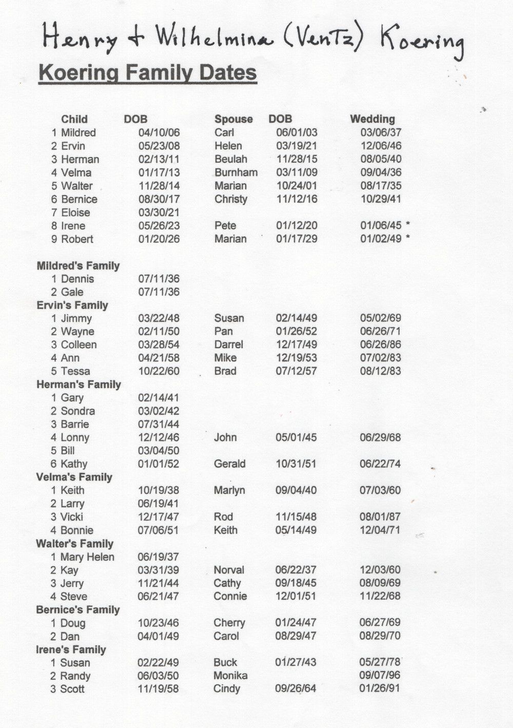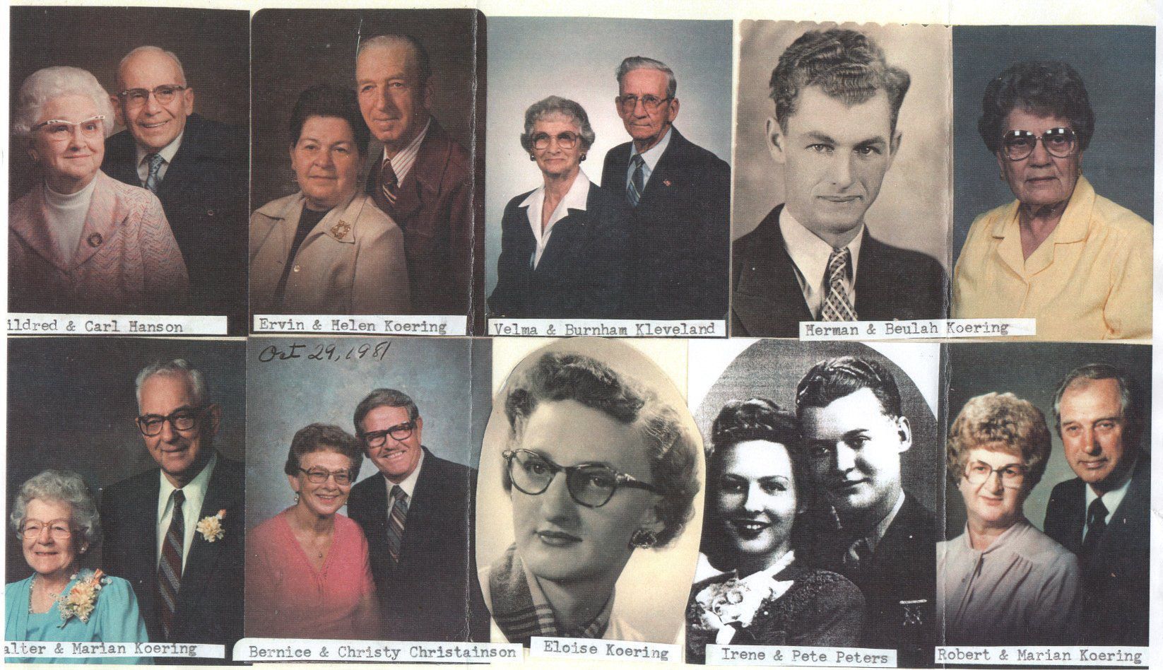 Henry and Minnie Koering had nine children from 1906 to 1926 (see chart). As shown in a collage of photos, these nine children included Mildred Koering (Mrs. Carl Hanson), Ervin (Helen) Koering, Herman (Beulah) Koering, Velma Koering (Mrs. Burnham Kleveland), Walter (Marian) Koering), Bernice (Mrs. Chris Christianson), Eloise Koering, Irene (Mrs. Pete Peters), and Robert (Marian) Koering.
