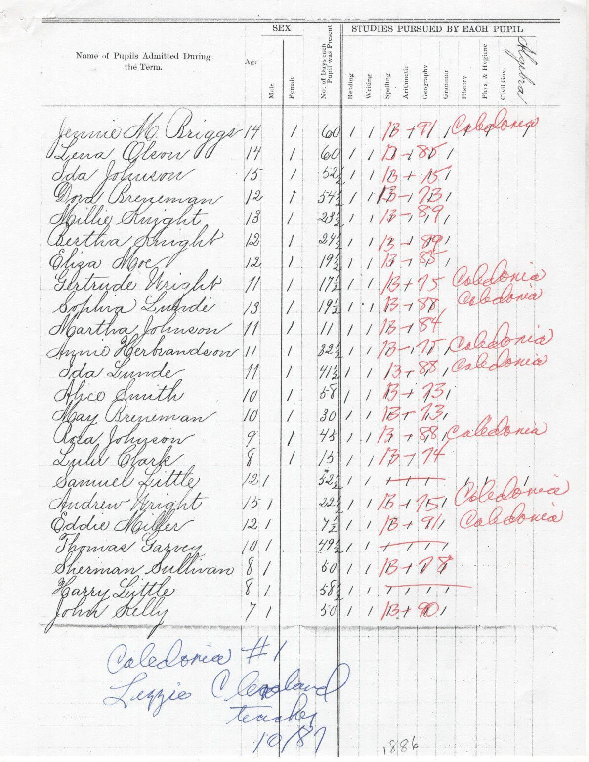 In October 1887, Caledonia School No. 1 teacher Lizzie Cleveland reported attendances and studies pursued for 23 students, including Dora Breneman, May Breneman, Jennie Briggs, Lulu Clark, Thomas Garvey, Annie Herbrandson, Ida Johnson, Martha Johnson, Rosa Johnson, John Kelly, Bertha Knight, Millie Knight, Harry Little, Samuel Little, Ida Lunde, Sophia Lunde, Eddie Miller, Elisa Moe, Lena Olson, Alice Smith, Sherman Sullivan, Andrew Wright, and Gertrude Wright.