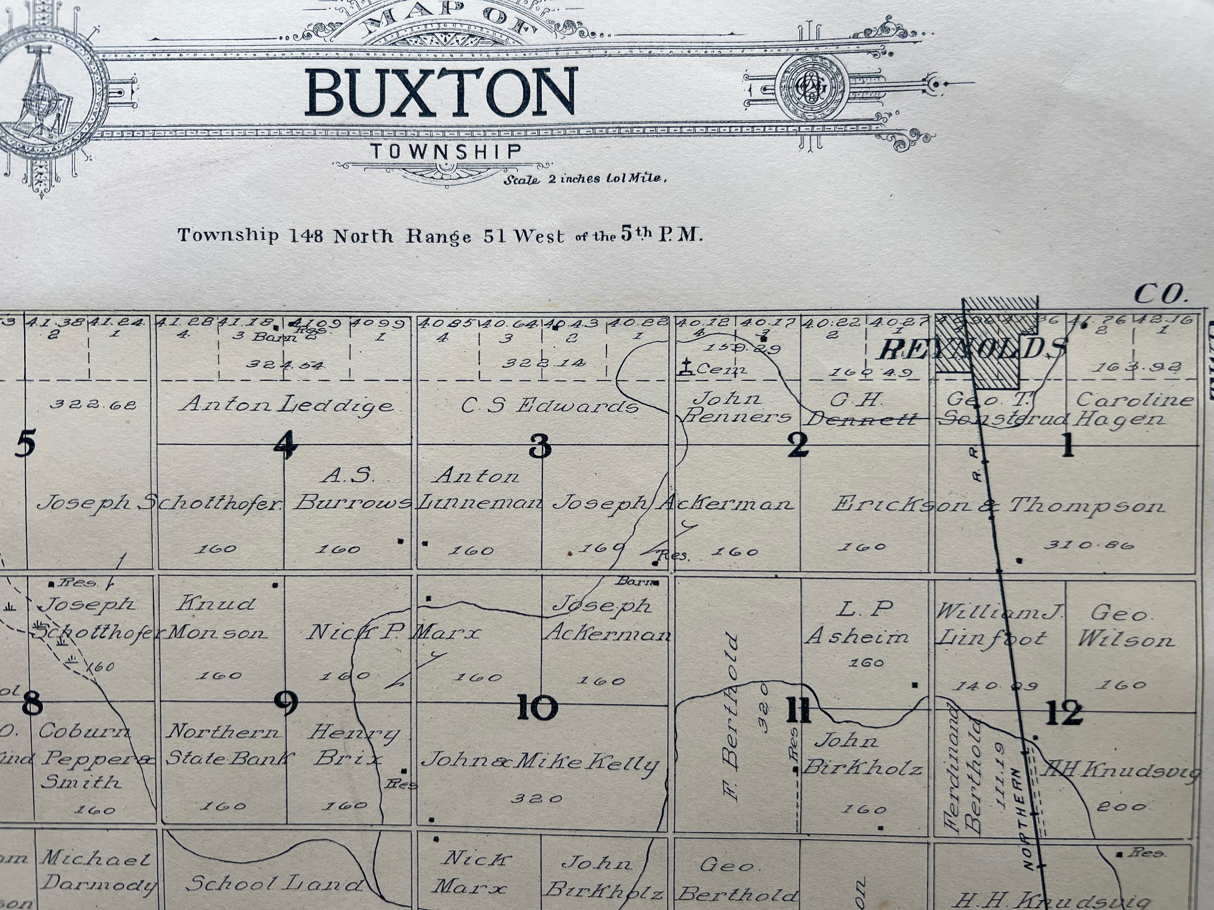 Tax records document that by 1903, Joseph Ackerman also owned the SW Qtr. of Section 2 in Buxton Township and by 1905, Joseph also owned the NE Qtr. of Section 10, which is shown on the plat map for Buxton Township in the 1909 Traill County Atlas. In 1909, the Joseph Ackerman family residence was in the corner of the SW Qtr. of S. 3, and a barn was located across the road in the corner of the NE Qtr. of S. 10.