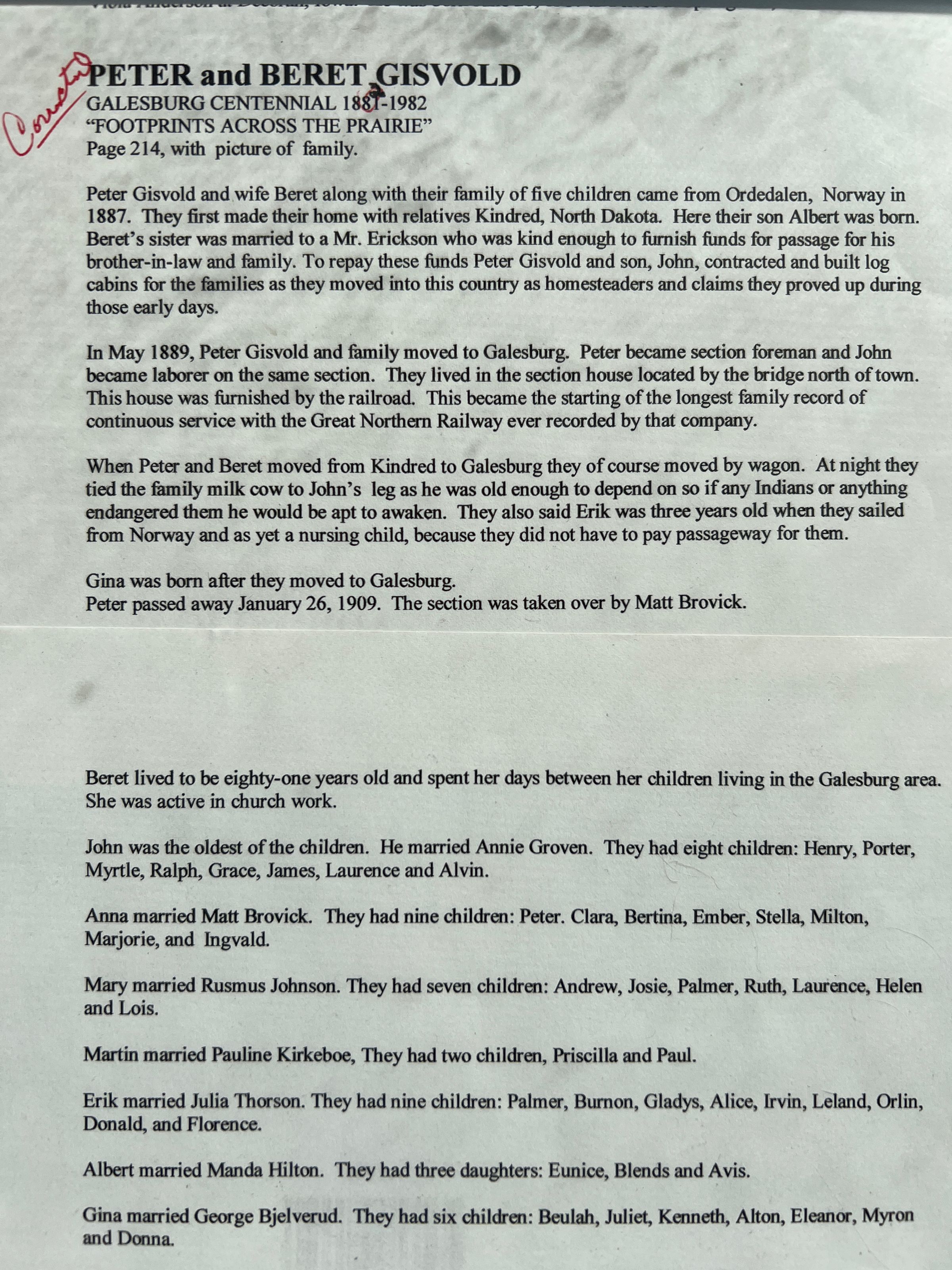 Excerpts from page 214 of the Galesberg Centennial !882 - 1982 book on the lives of Peter and Beret Gisvold, who settled in Galesburg in 1889. Peter was foreman for the Galesburg section of the Great Northern Railroad, and along with his son, John Gisvold, started the longest family record of continuous service with the GNR ever recorded by that company.Cataloged By