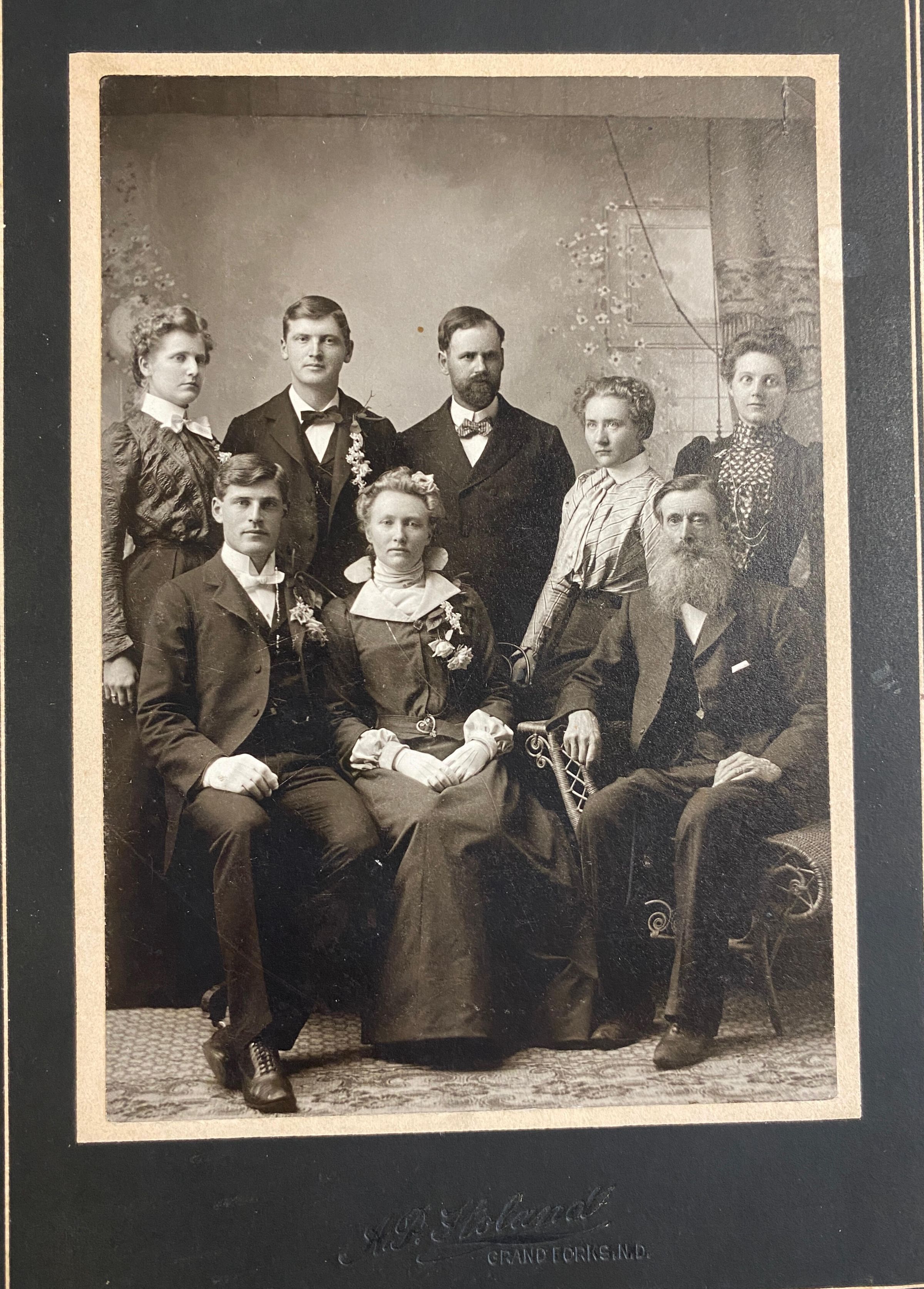 Figenskau Family - Wedding of Mr. & Mrs. Henry (Claire Figenskau) Thompson.Father - Knut Figenskau, children - Magdalena Hansina (Figenskau) Carlson, Anne Martha (Figenskau) Lee, Tina/Tine/Thea Figenskau, Jens Christian Figenskau, Clara Wilhelmine (Figenskau) Thompson, and Thomas Figenskau.Subject Person or Organization