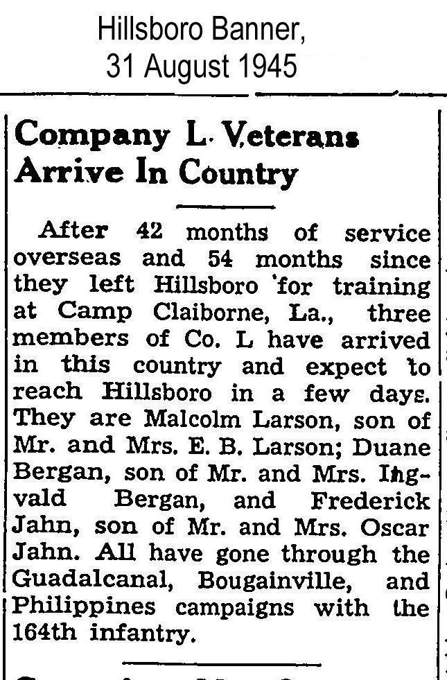 After training at Camp Claiborne, Pvt Malcolm Larson also served in the US Army 164th infantry. Malcolm served several years in the South Pacific. When WWII ended, Sgt Malcolm Larson returned home, as reported in the 31 August 1945 Hillsboro Banner. Malcolm Larson was discharged from the US Army in September 1945.Cataloged By