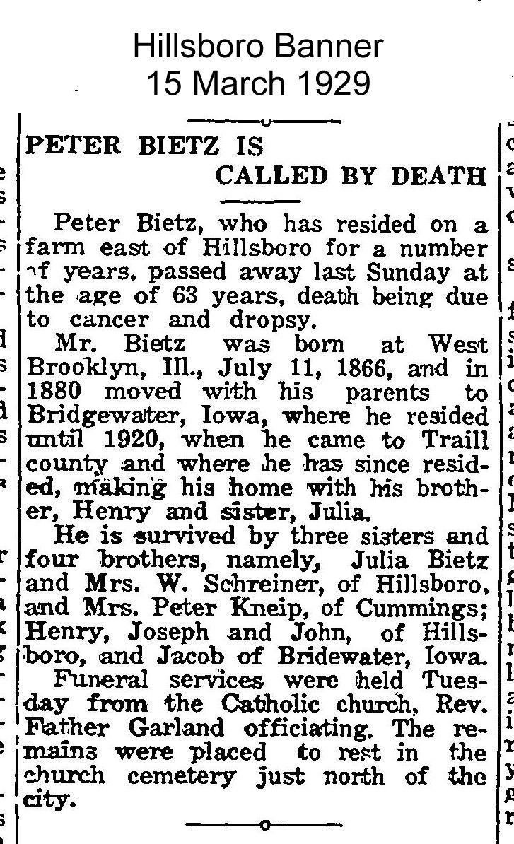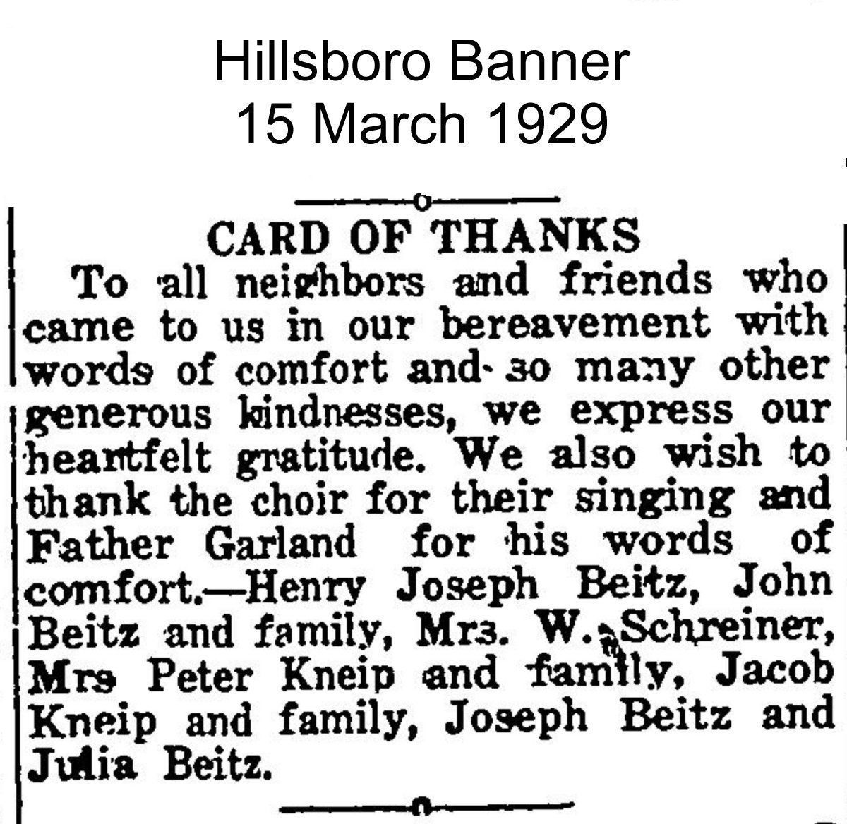 On 9 March 1929, Peter Beitz passed away, age 61, of cancer (see obituary, Hillsboro Banner, 15 Mar. 1929, left). After funeral services held at St. Rose of Lima Catholic Church in Hillsboro, Henry was interred at the Catholic Calvary Cemetery by Hillsboro [photo of grave-maker, below]. With Peter's passing, his siblings thanked neighbors and friends for their comfort over their brother's death (see Card of Thanks, Hillsboro Banner, 15 Mar. 1929, below).