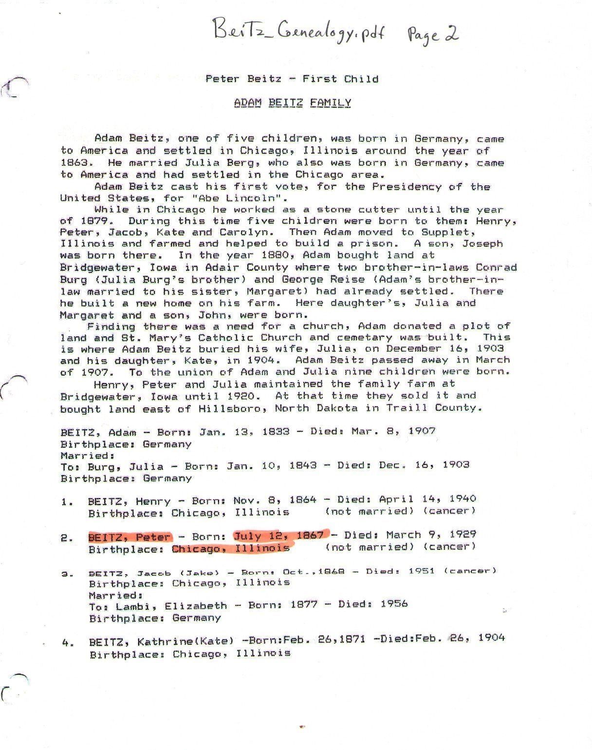 Peter Beitz was born on 12 July 1867 in Chicago, IL, the second of ten children born to Adam and Julia (Burg) Beitz (see TCHS Catalogit family history entry 2022.268.1, and Beitz_Genealogy.pdf*, pages 2 & 4, below). Peter was raised in the Chicago area until the age of 12 when in 1880 his parent's bought farmland near Bridgewater in Jackson Township in Adair County, Iowa.