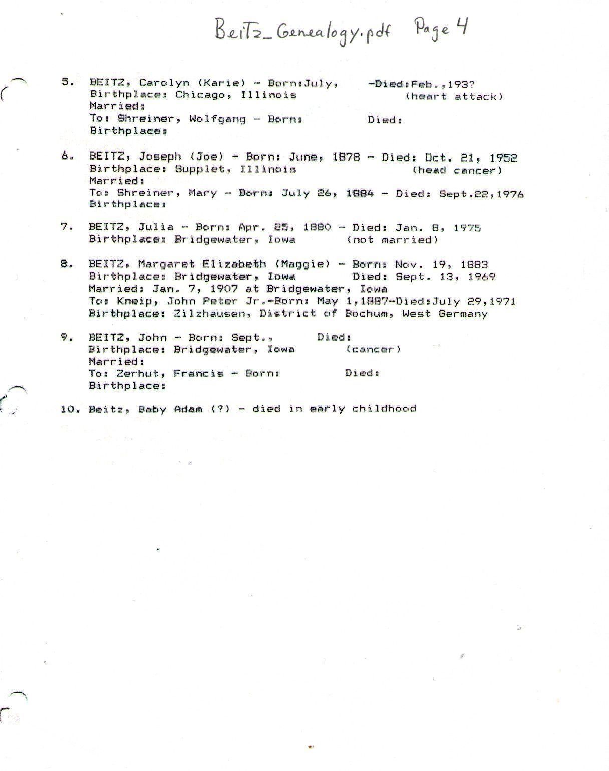 *a Beitz_Genealogy.pdf document was compiled and written by Karen (Fleischer) Ackerman and kindly proved to the TCHS by Karen's granddaughter Jackie (Ausk) Baumgartner. This document is available for viewing as a printed document and on a PC from a USB flash-drive kept in the Adam Beitz family history folder, which is located on a shelf in the Resource Room at the TCHS Plummer House Museum in Hillsboro, ND (also see Catalogit family history entry 2022.268.1).Acquisition