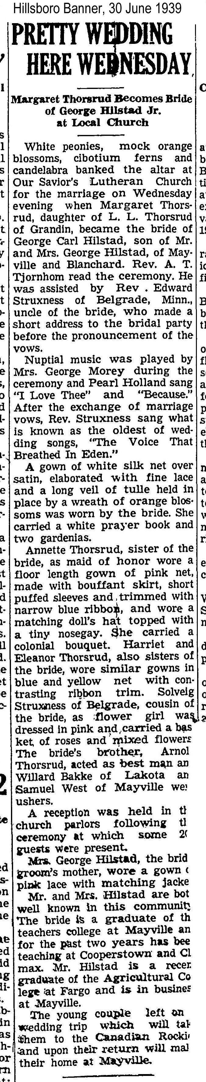 The wedding of Margaret Thorsrud to George Hilstad Jr. was held on 28 June 1939 at Our Savior's Lutheran Church in Hillsboro, ND, as described in the 30 June issue of the Hillsboro Banner.Cataloged By