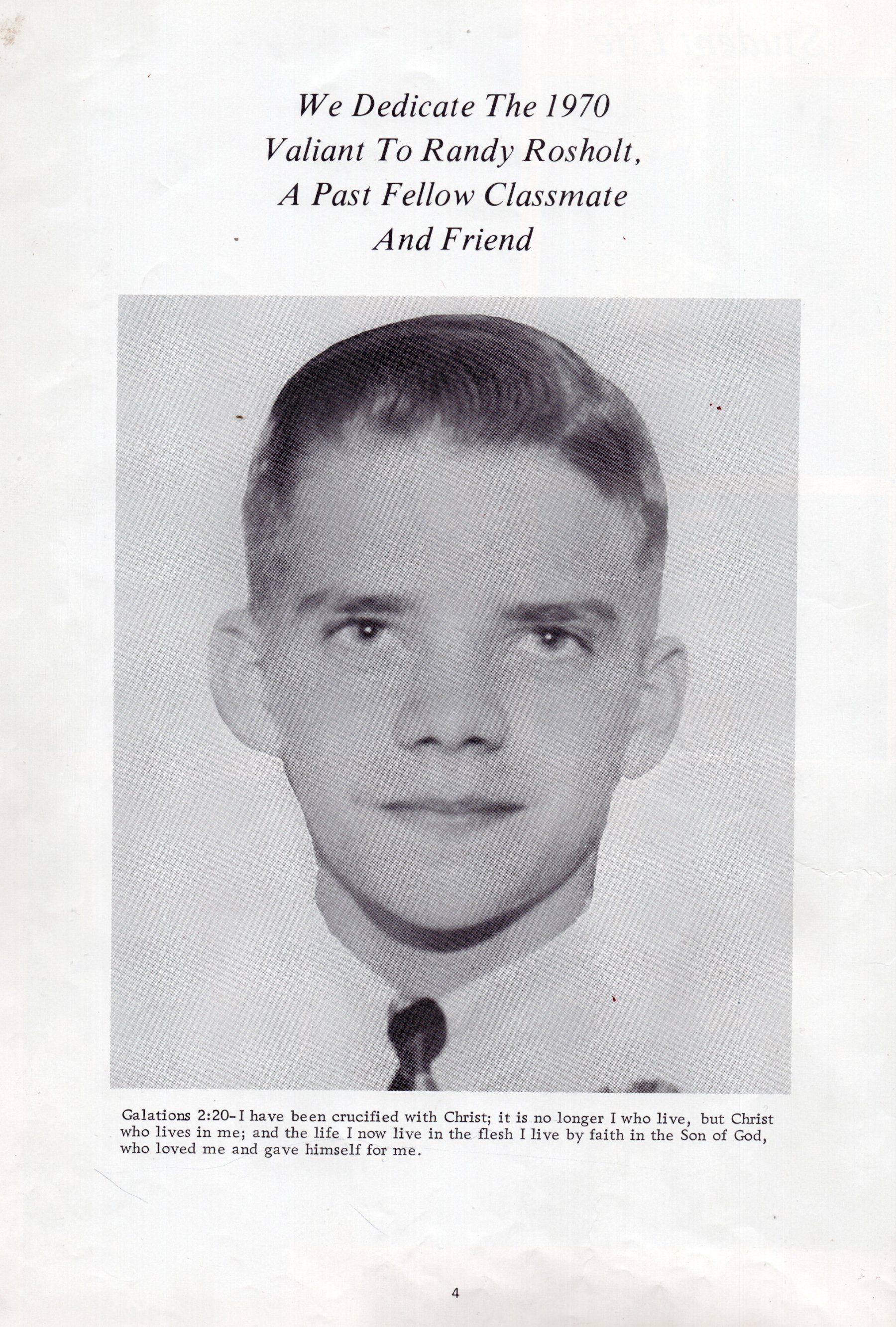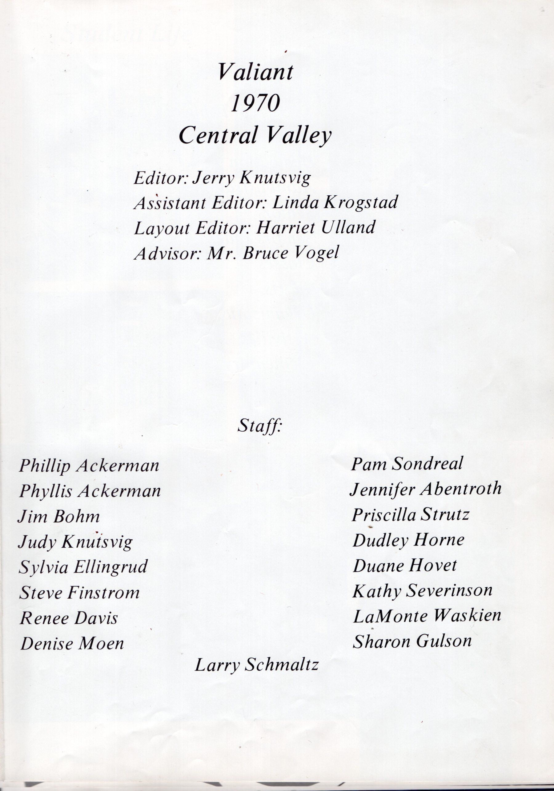 The Class of 1970 Central Valley High School Yearbook, titled "The Valiant", was produced by Annual Staff students and includes a Table of Contents. This yearbook was dedicated to Randy Rosholt, a former classmate and friend.