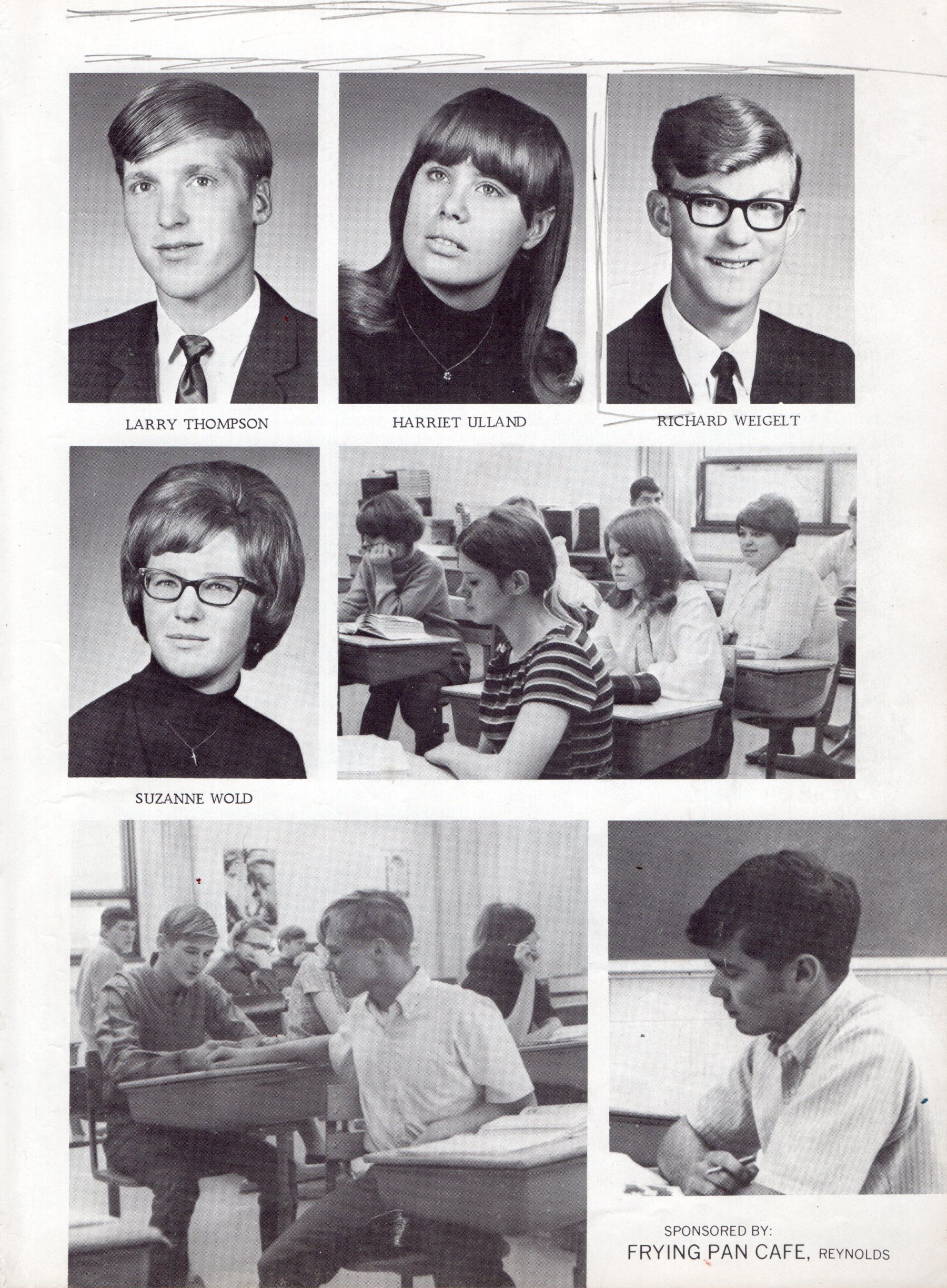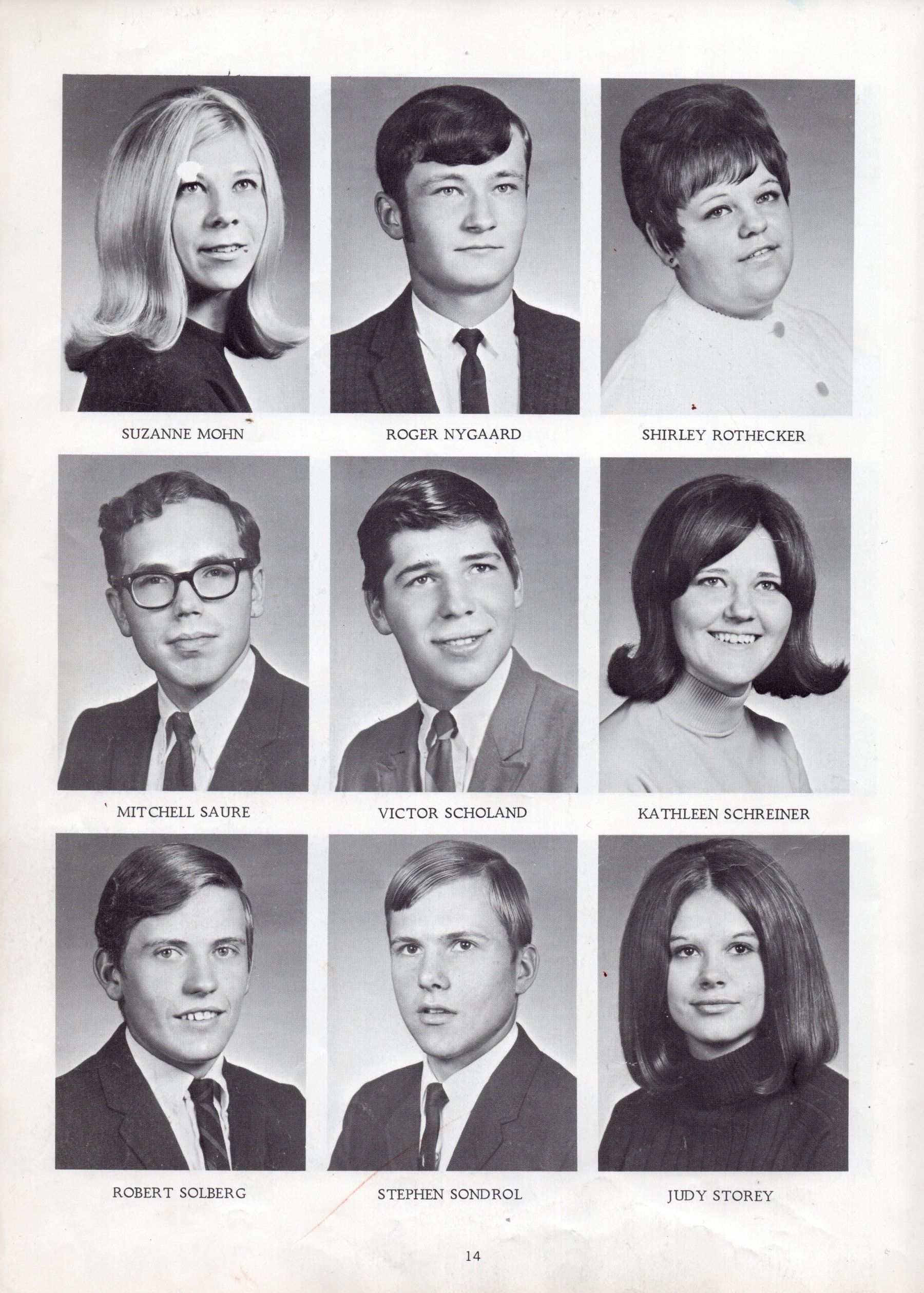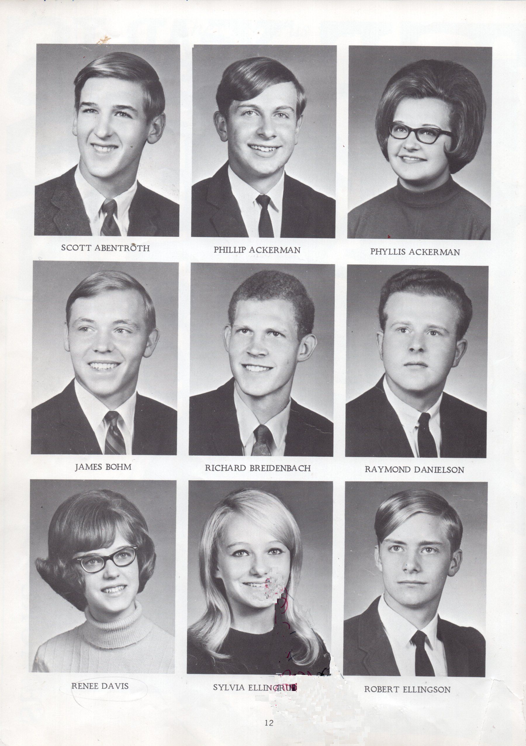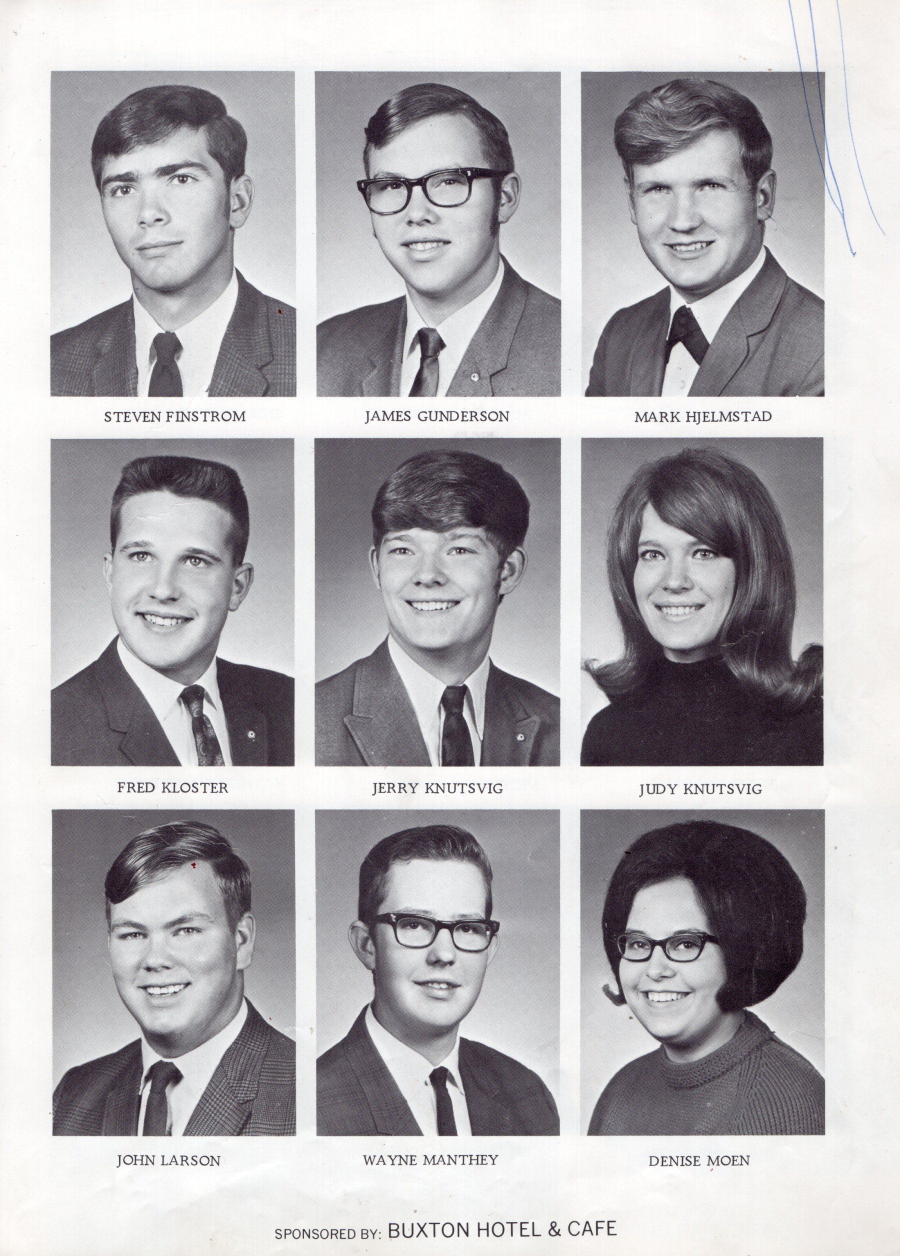 The Senior Class of 1970 yearbook had 31 student photos: Scott Abentroth, Phillip Ackerman, Phyllis Ackerman, James Bohm, Richard Breidenbach, Raymond Danielson, Renee Davis, Sylvia Ellingrud, Robert Ellingson, Steven Finstrom, James Gunderson, Mark Hjelmstad, Fred Kloster, Jerry Knutsvig, Judy Knutsvig, John Larson, Wanye Manthey Denise Moen, Suzanne Mohn, Roger Nygaard, Shirley Rothecker, Mitchell Saure, Victor Scholand, Kathleen Schreiner, Robert Solberg, Stephen Sondrol, Judy Storey, Larry Thompson, Harriet Ulland, Richard Weigelt, and Suzanne Wold.