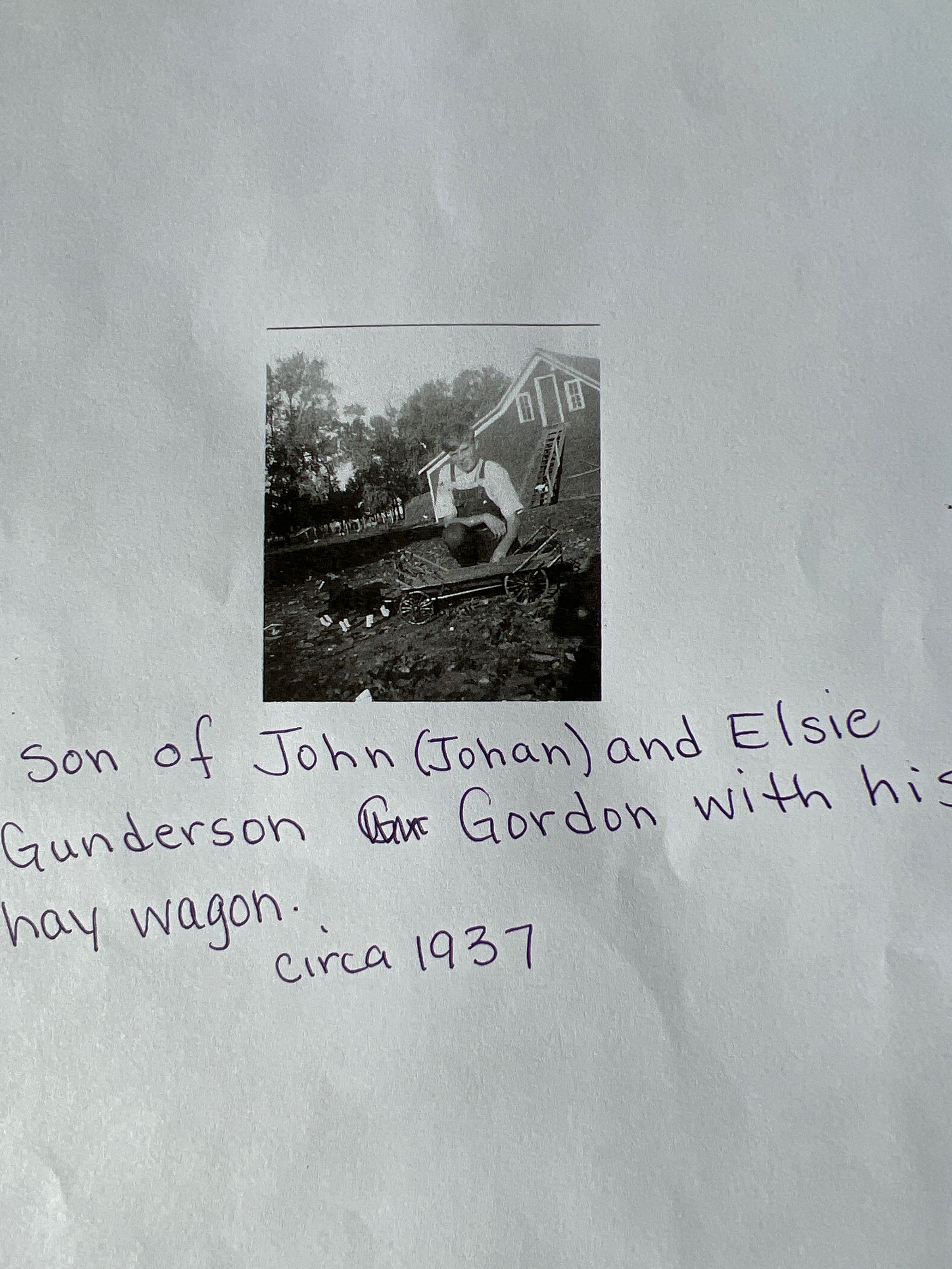 This folder has photos and documents donated by Susie (Gunderson) Van Buskirk of Portland, OR, on hie father, Gordon Gunderson, and his parents, John and Elsie Gunderson, of rural Cummings, ND>Cataloged By
