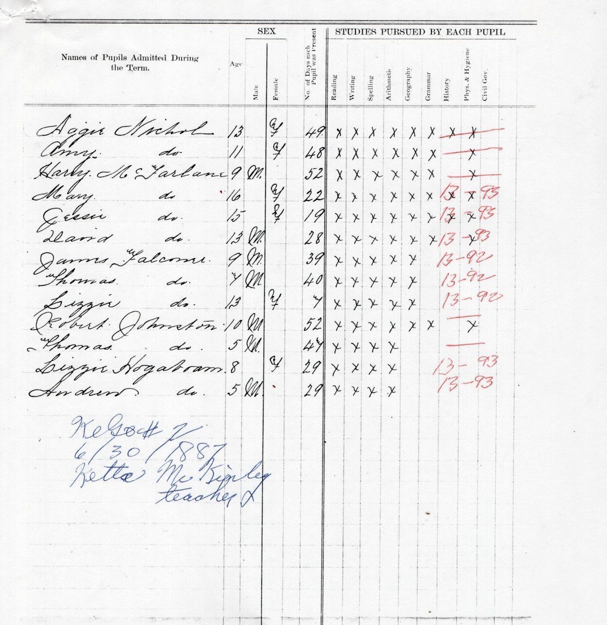 On 30 June 1887, Kelso School No. 2 teacher, Ketta McKinley, reported the attendance of 13 students: James Falconer, Lizzie Falconer, Thomas Falconer, Andrew Hogaboam, Lizzie Hogaboam, Robert Johnston, Thomas Johnston, David McFarlane, Harry McFarlane, Jessie McFarlane, Mary McFarlane, Aggie Nichol, and Amy Nichol.