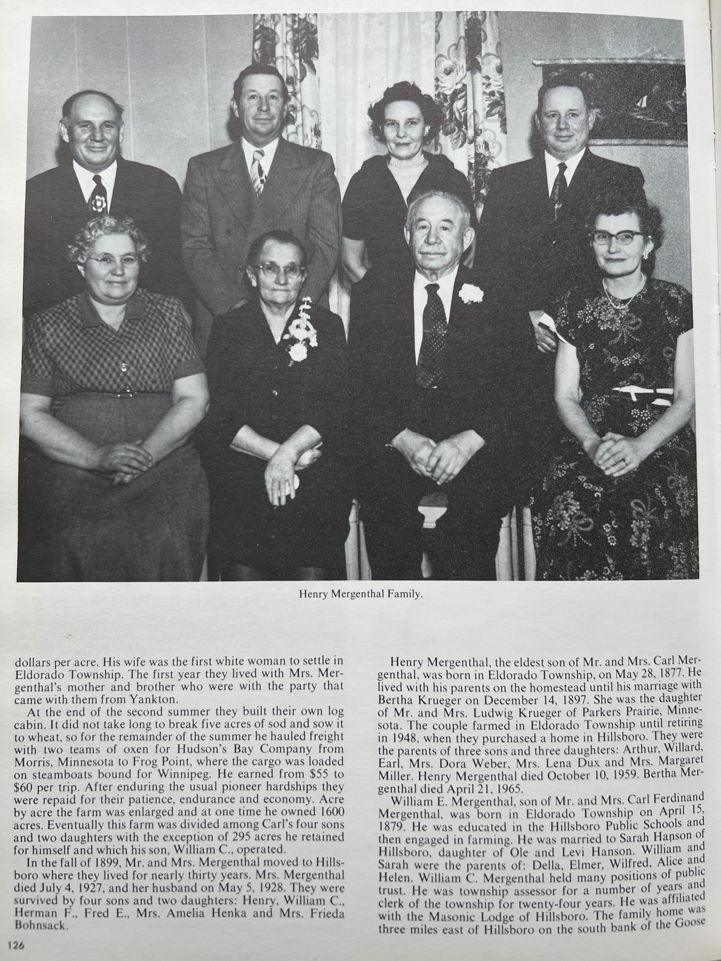 This folder contains web search results for Mergenthal's of Traill County conducted by Gerry Mohn, TCHS volunteer. Carl and Dora (Gronke) Mergenthal were pioneers along the Goose River in what is now Eldorado Township in Traill County. It is reported that Dora was the first white women to settle in Eldorado Township. Carl and Dora's oldest son, Henry, and his wife Bertha (Krueger) Mergenthal also farmed in Eldorado Township. The book, Yesteryears in Traill, Vol. I, presents a history of the Carl and Dora Mergenthal family on pages 125 & 126.Cataloged By