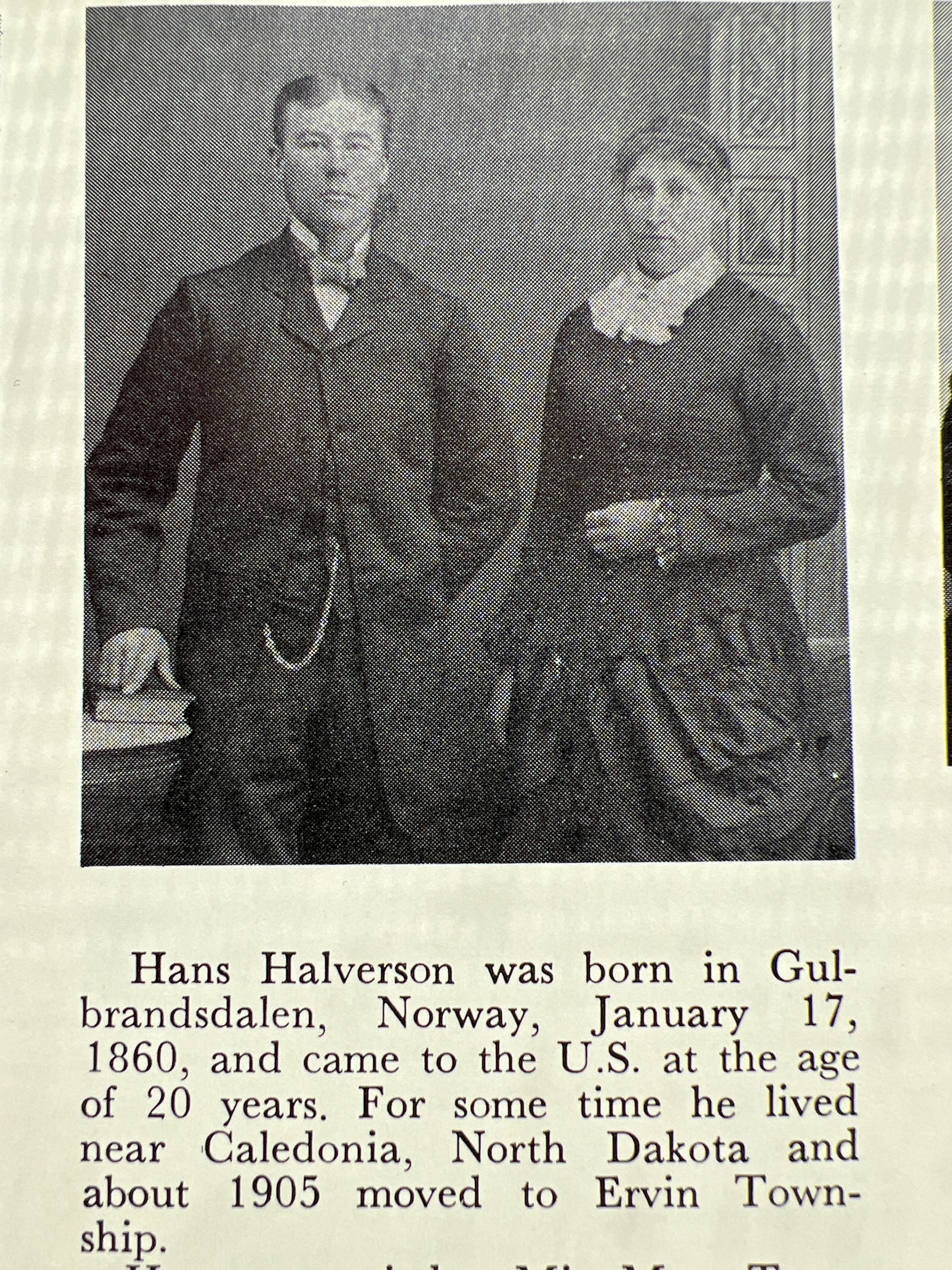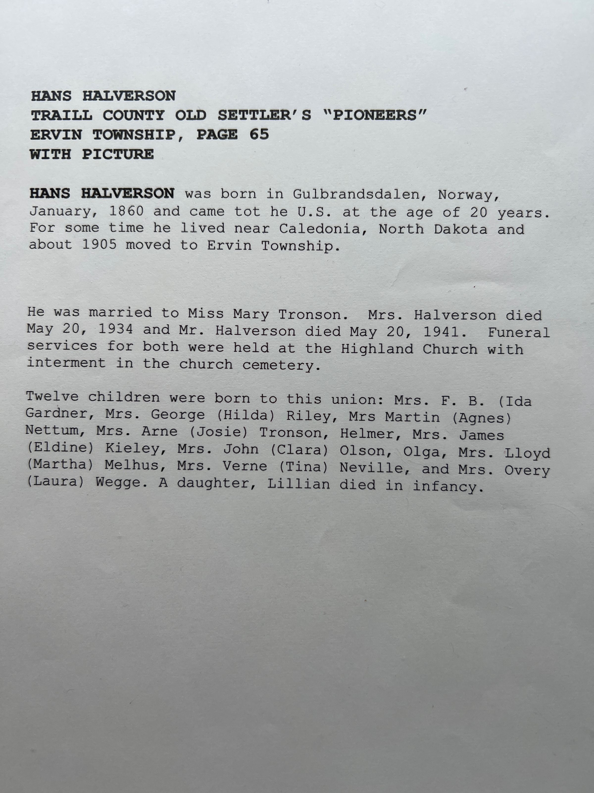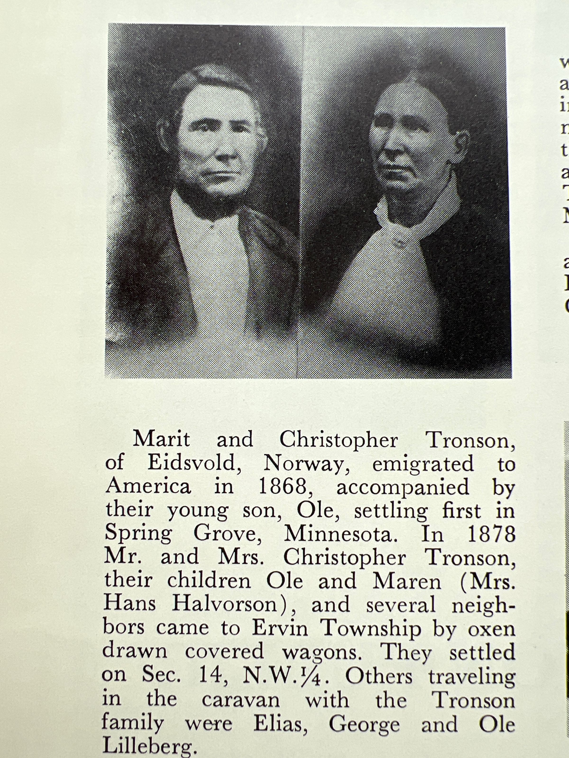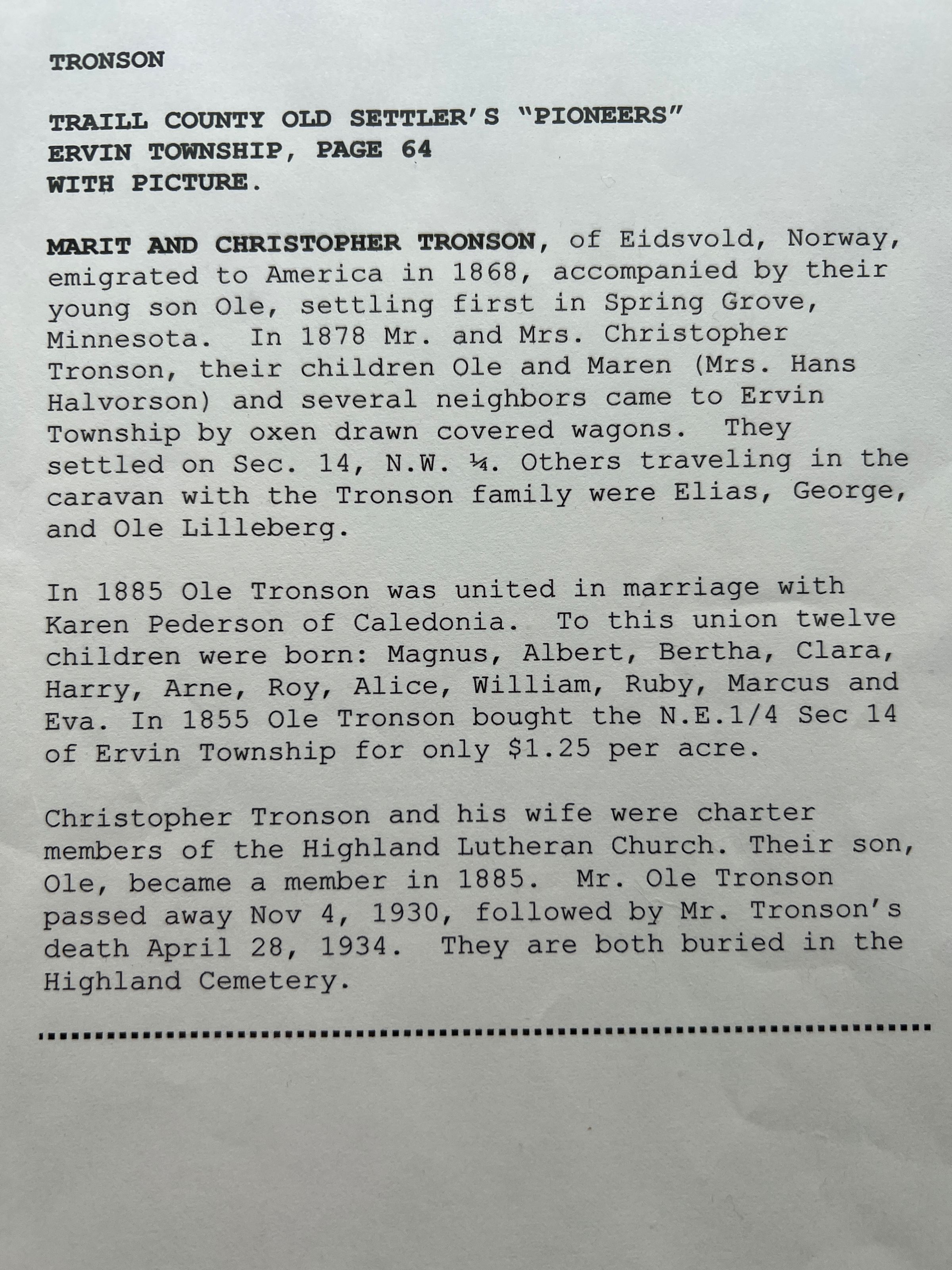 This file has information on Christopher and Marit Tronson from page 64 in Traill County Old Settler's "Pioneers" of Ervin Township. Christopher and Marit had two children, Ole and Maren. Their son Ole Tronson married Karen Pederson of Caledonia and they also settled in Ervin Township and had 12 children. Their daughter, Maren or Mary Tronson married Hans Halverson (1860 - 1941) who also settled in Ervin Township. Hans and Mary Halverson had 12 children.Cataloged By