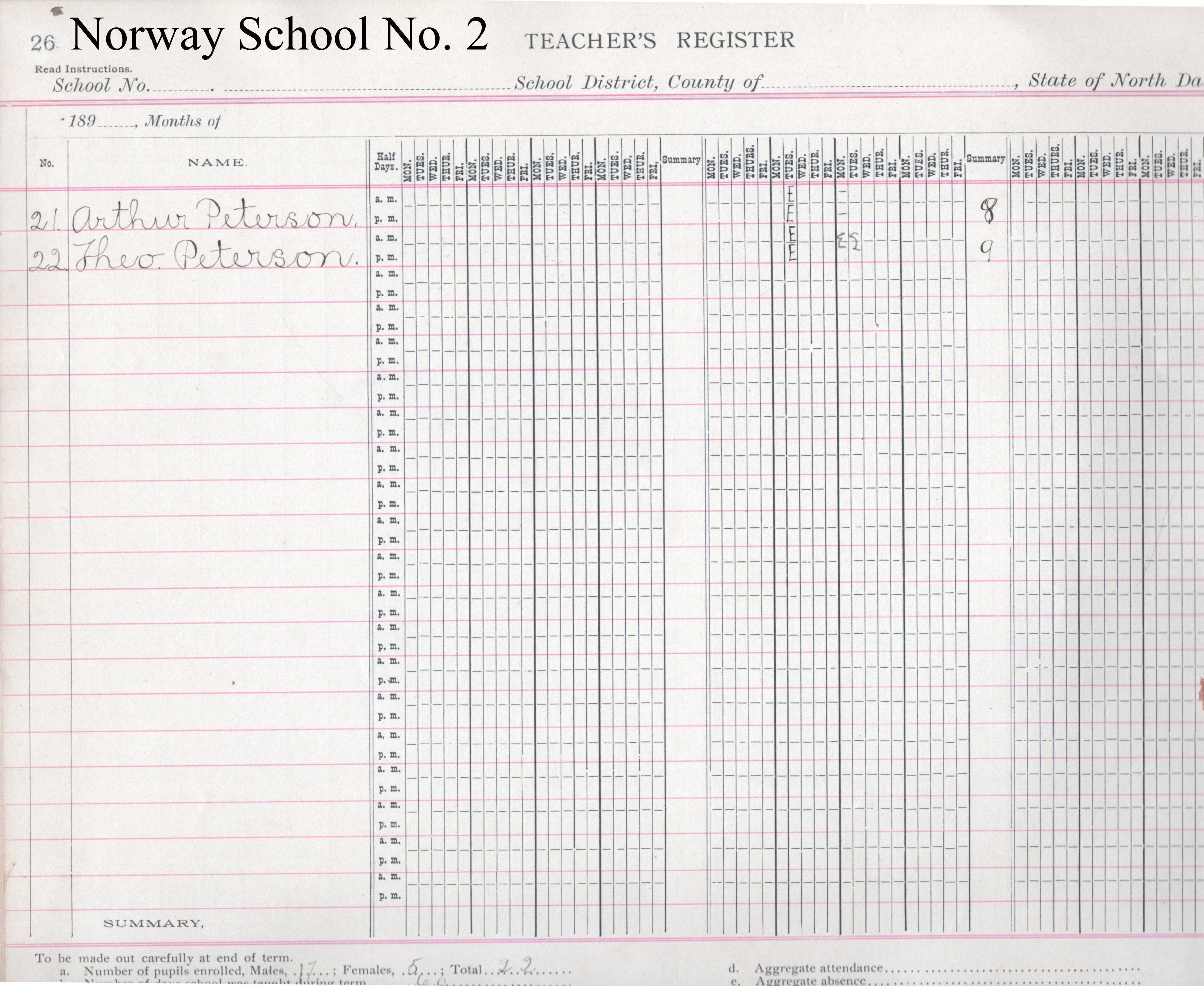 The 1897 Norway School No. 2 Teacher's Registry book was donated to the TCHS where it is available for viewing at the Traill County Museum (Plummer House) in Hillsboro.Acquisition