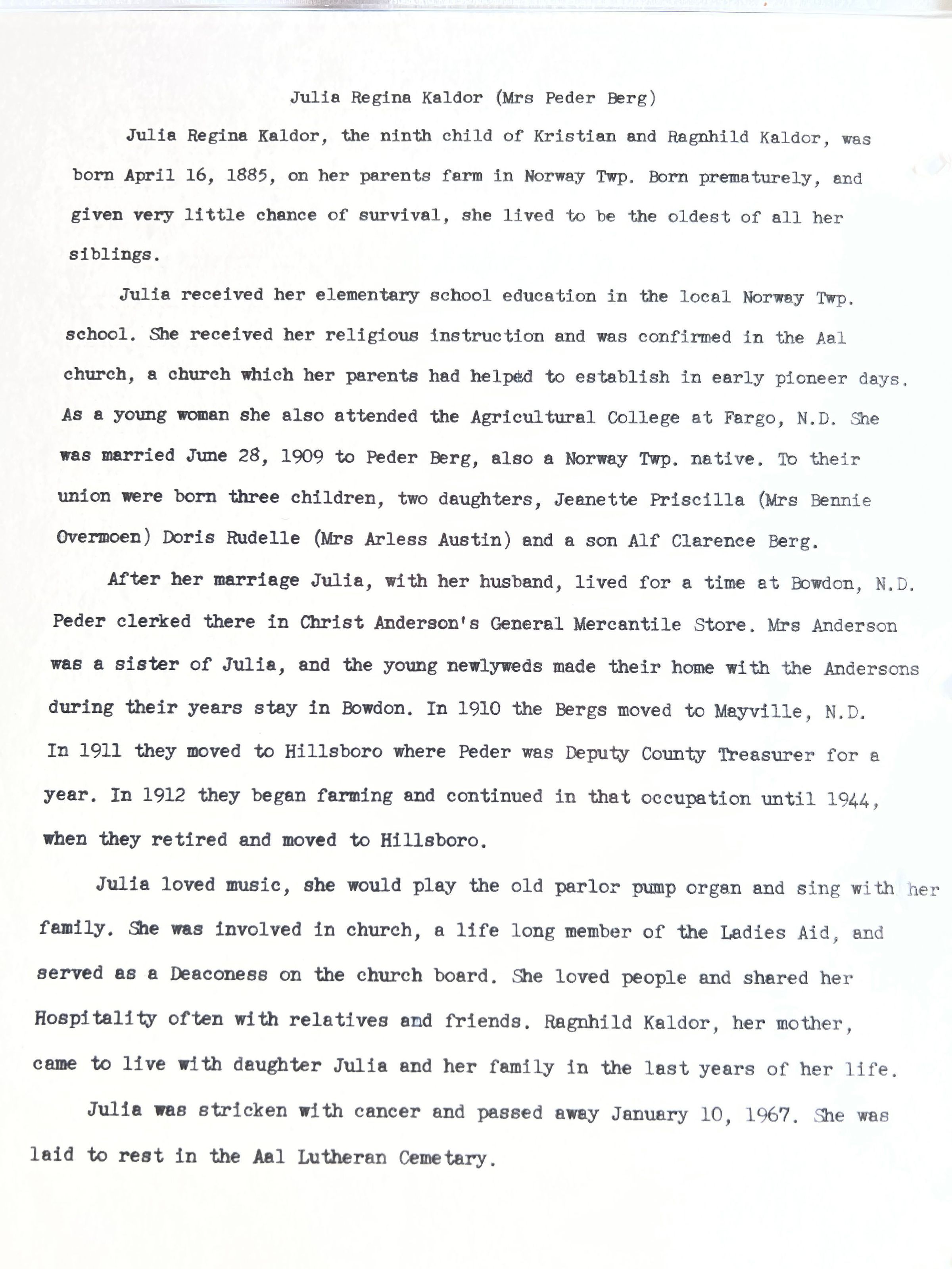 This folder contains a family history document on the life of Julia Kaldor, who was born in 1885 to parents Kristian and Ragnhild Kaldor and who married Peder Berg of Norway Township in 1909. After marrying, they briefly lived in Bowden and Mayville, ND, before settling in 1912 on a farm by Hillsboro. They farmed until 1944. After retiring, they moved into Hillsboro. Julia passed away in 1967 and was buried in the AAL Lutheran Cemetery.Acquisition