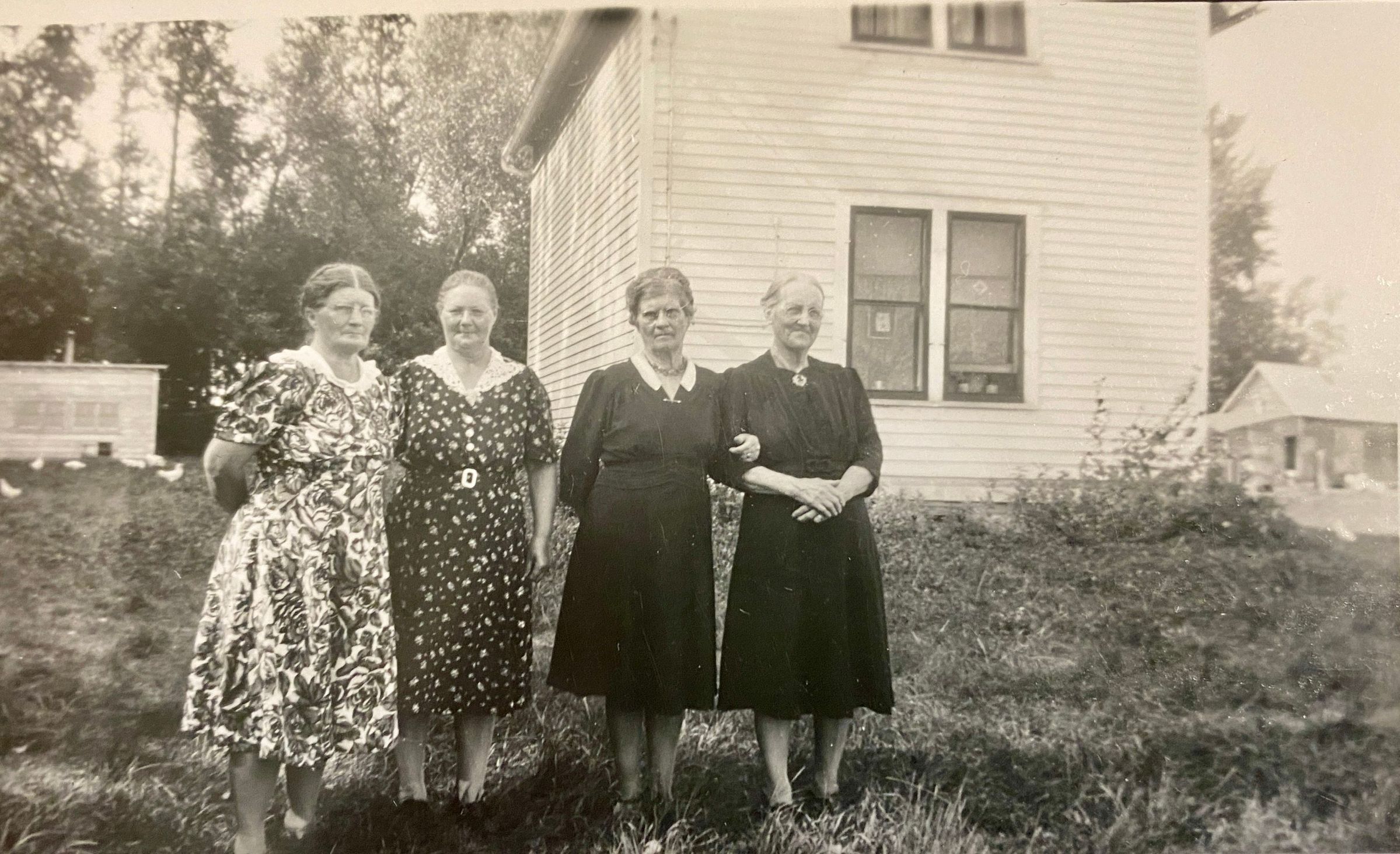 Mrs. Peder Tweden, Mrs. Albert Hovet, Mrs. Isaac Lee, and Mrs. John K. Hovet. This photo was likely taken in August 1945 when the Hillsboro Banner reported that Mrs. Maggie Hovet of Grand Forks and Mrs, Isaac Lee of Canada, visited the home of Mrs. Albert Hovet.