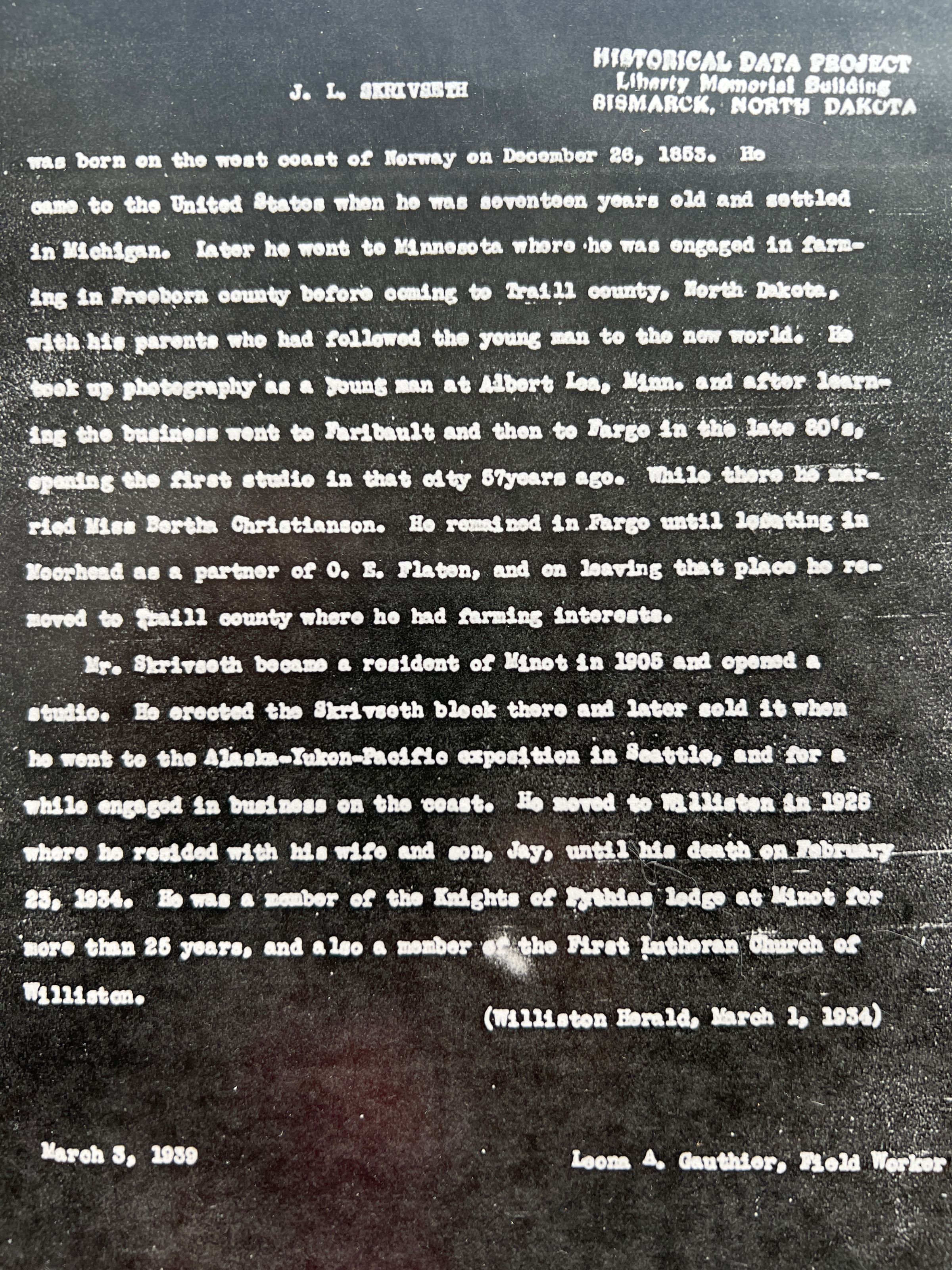 This file has an article copied from the Historical Data Project (in Williston Herald, 1 March 1934) about J. L. Skrivseth (1853 - 1934).Cataloged By