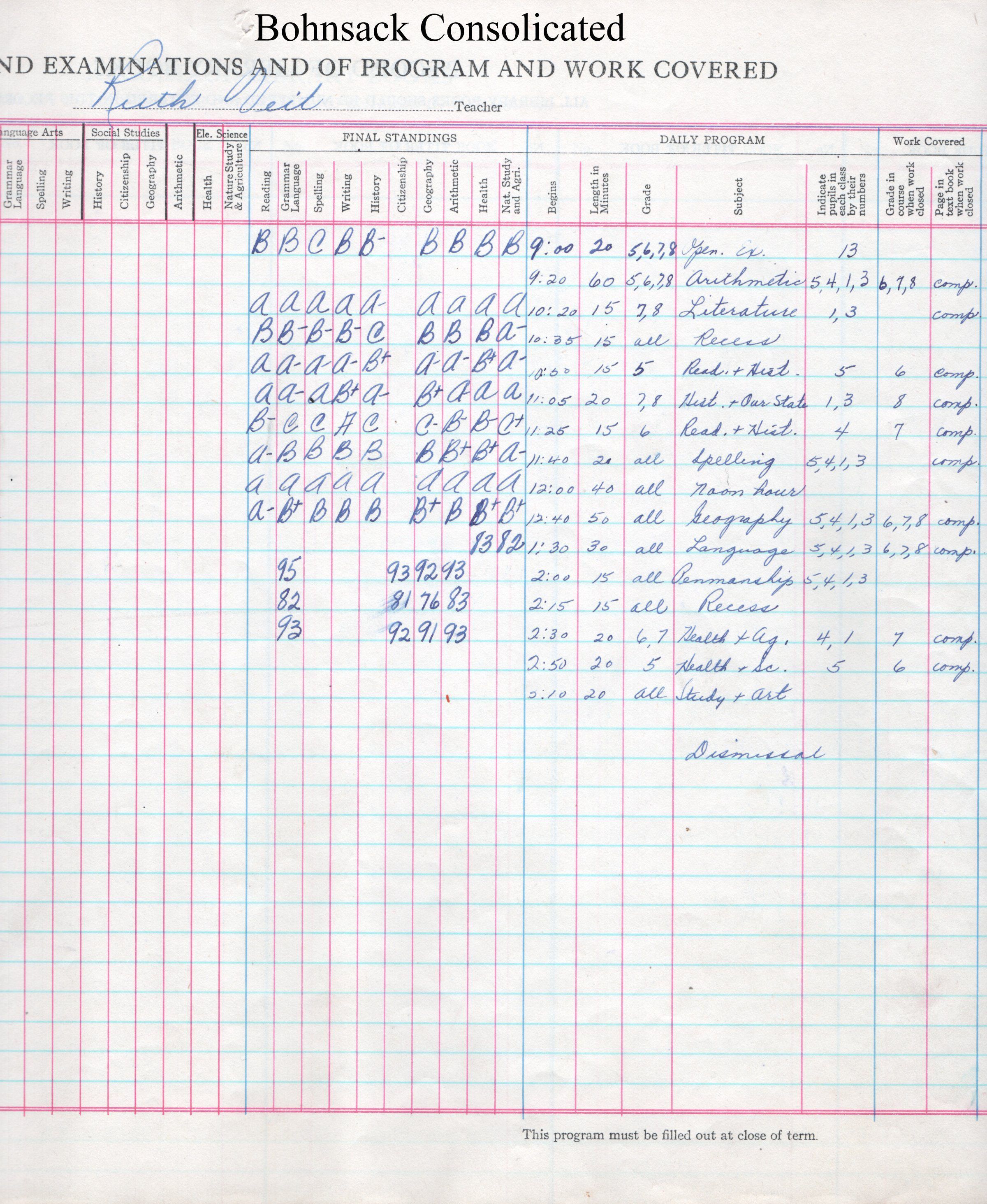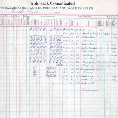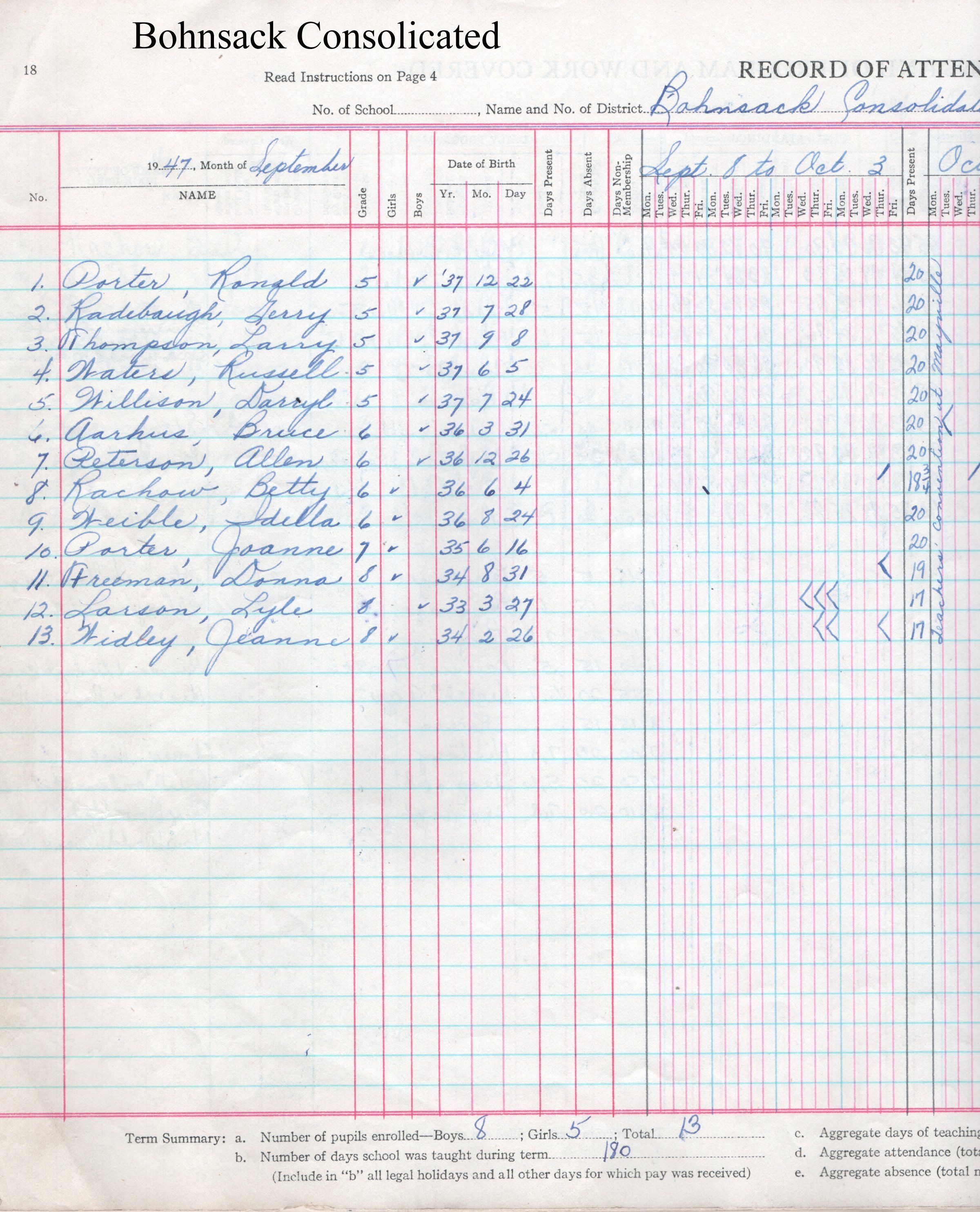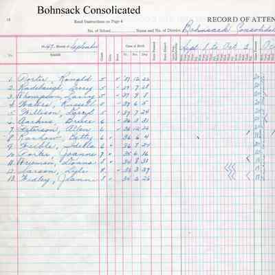 During the 1946-1947 school year, Bohnsack Consolidated teacher Vernola Cooper recorded the attendance of students in her grades 5 to 8. Students included Bruce Aarhus, Donna Freeman, Lyle Larson, Allen Peterson, JoAnne Porter, Ronald Porter, Betty Rachow, Larry Thompson, Gerry Radebaugh, Russell Waters, Idella Weible, Jeanne Widley and Darryl Willison.Acquisition