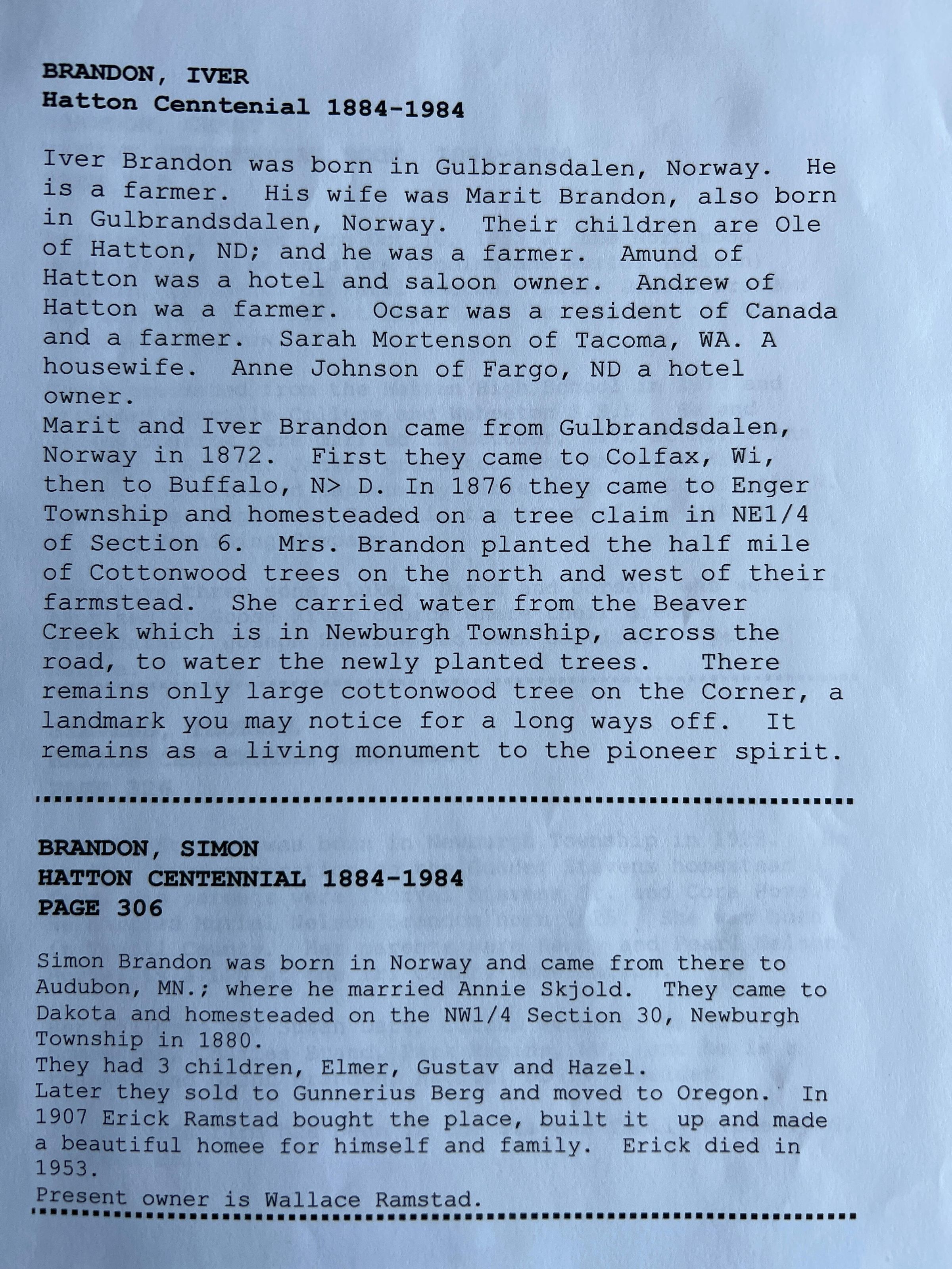 This family folder has excerpts from the "Hatton Centennial 1884-1984" book on the lives of Ivor, Simon, Grant, and Muriel (Mrs. Thorval Stavens) Brandon.Cataloged By